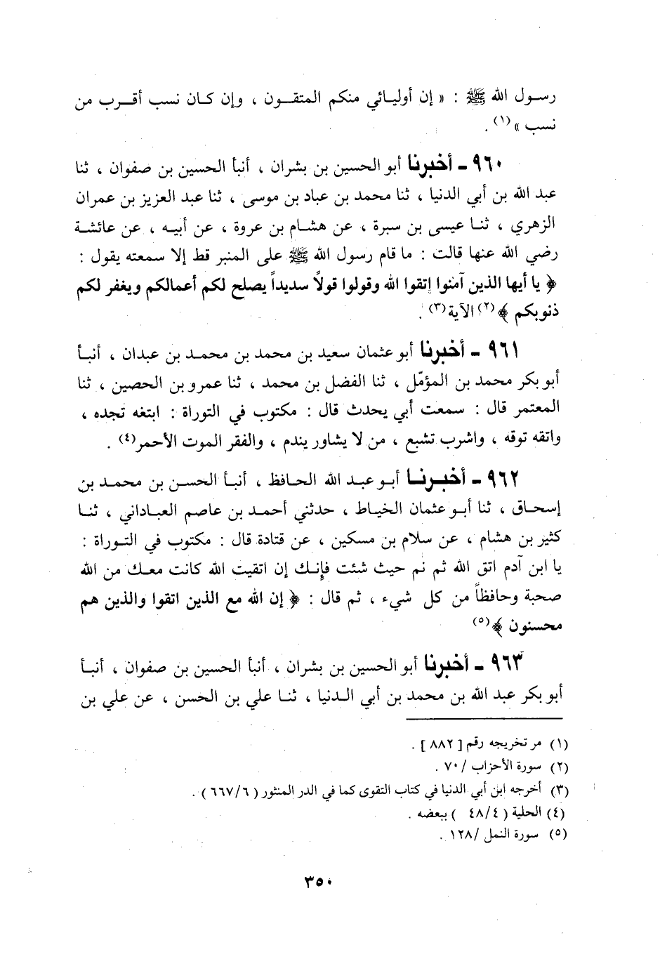 962 - أَخْبَرَنَا أَبُو عَبْدِ اللَّهِ الْحَافِظُ، أَنْبَأَ الْحَسَنُ بْنُ مُحَمَّدِ بْنِ إِسْحَاقَ، ثنا أَبُو عُثْمَانَ الْخَيَّاطُ، حَدَّثَنِي أَحْمَدُ بْنُ عَاصِمٍ الْعَبَّادَانِي، ثنا كَثِيرُ بْنُ هِشَامٍ، عَنْ سَلَّامِ بْنِ مِسْكِينٍ، عَنْ قَتَادَةَ قَالَ: مَكْتُوبٌ فِي التَّوْرَاةِ: يَا ابْنَ آدَمَ " §اتَّقِ اللَّهَ، ثُمَّ نَمْ حَيْثُ شِئْتَ، فَإِنَّكَ إِنِ اتَّقَيْتَ اللَّهَ كَانَتْ مَعَكَ مِنَ اللَّهِ صُحْبَةٌ وَحَافِظٌ مِنْ كُلِّ شَيْءٍ ثُمَّ قَالَ: {إِنَّ اللَّهَ مَعَ الَّذِينَ اتَّقَوْا وَالَّذِينَ هُمْ مُحْسِنُونَ} [النحل: 128] "