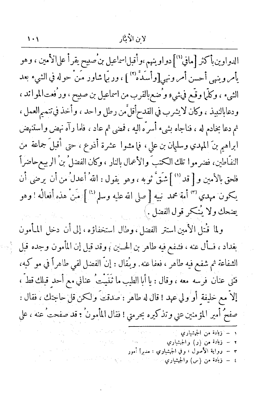 الدواوين بأكثر ما في دواوينهم، وأقبل إسماعيل بن صبيح يقرأ على الأمين، وهو يأمر وينهى أحسن أمر ونهي وأسده، وربما شاور من حوله في الشيء بعد الشيء، وكلما وقع في شيء وضع بالقرب من إسماعيل بن صبيح، ورفعت الموائد، ودعا بالنبيذ، وكان لا يشرب في القدح أقل من رطل واحد، وأخذ في تتميم العمل، ثم دعا بخادم له، فناجاه بشيء أسره إليه، فمضى ثم عاد، فلما رآه نهض واستنهض إبراهيم بن المهدي وسليمان بن علي، فما مشوا عشرة أذرع، حتى أقبل جماعة من النفاطين، فضرموا تلك الكتب والأعمال بالنار، وكان الفضل بن الربيع حاضراً فلحق بالأمين وقد شق ثوبه، وهو يقول: الله أعدل من أن يرضى أن يكون مهدي أمة محمد نيه صلى الله عليه وسلم من هذه أفعاله! وهو يضحك ولا ينكر قول الفضل.