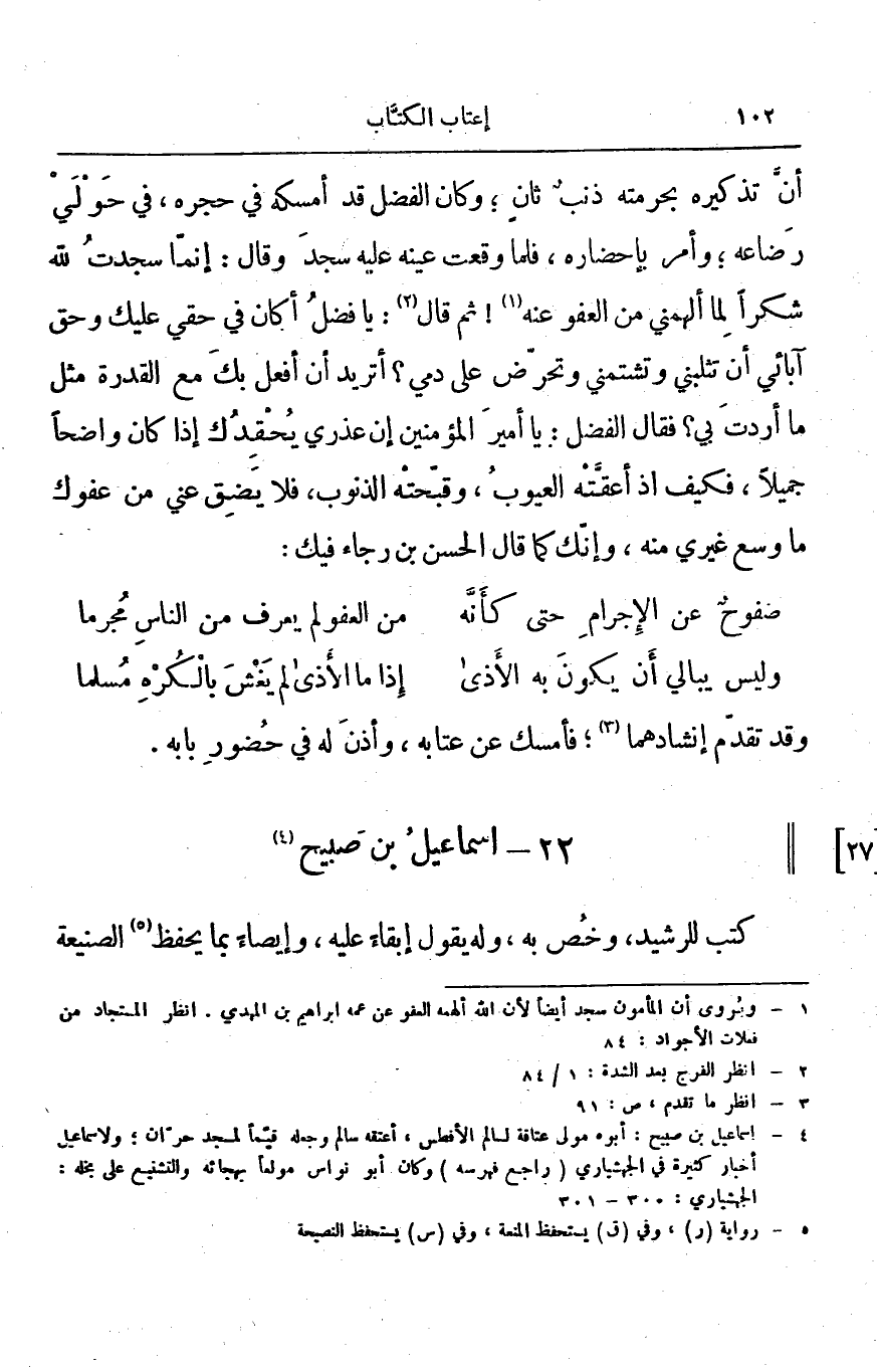 أن تذكيره بحرمته ذنب ثان؛ وكان الفضل قد أمسكه في حجره، في حولي رضاعه؛ وأمر بإحضاره، فلما وقعت عينه عليه سجد وقال: إنما سجدت لله شكراً لما ألهمني من العفو عنه! ثم قال: يا فضل أكان في حقي عليك وقح آبائي أن تثلبني وتشتمني وتحرض على دمي؟ أتريد أن أفعل بك مع القدرة مثل ما أردت بي؟ فقال الفضل: يا أمير المؤمنين إن عذري يحقدك إذا كان واضحاً جميلاً، فكيف إذ أعقته العيوب، وقبحته الذنوب، فلا يضق عني من عفوك ما وسع غيري منه، وإنك كما قال الحسن بن رجاء فيك: