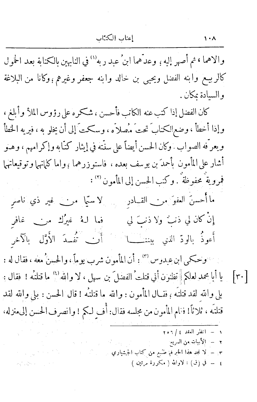 كان الفضل إذا كتب عنه الكاتب فأحسن، شكره على رؤوس الملأ وأبلغ، وإذا أخطأ، وضع الكتاب تحت مصلاه، وسكت إلى أن يخلو به، فيريه الخطأ ويعرفه الصواب. وكان الحسن أيضاً على سنته في إيثار كتابه وإكرامهم، وهو أشار على المأمون بأحمد بن يوسف بعده، فاستوزرهما؛ وأما كلماتهما وتوقيعاتهما فمروية محفوظة. وكتب الحسن إلى المأمون: