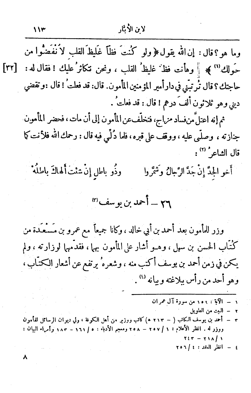 وما هو؟ قال: إن الله يقول " ولو كُنتَ فظّاً غَليظَ القلبِ لأنْفَضُّوا من حَولك " وهأنت فظ غليظ القلب، ونحن نتكاثر عليك! فقال له: حاجتك؟ قال ترتبني في دار أمير المؤمنين المأمون. قال: قد فعلت! قال: وتقضي ديني وهو ثلاثون ألف درهم! قال: قد فعلت.