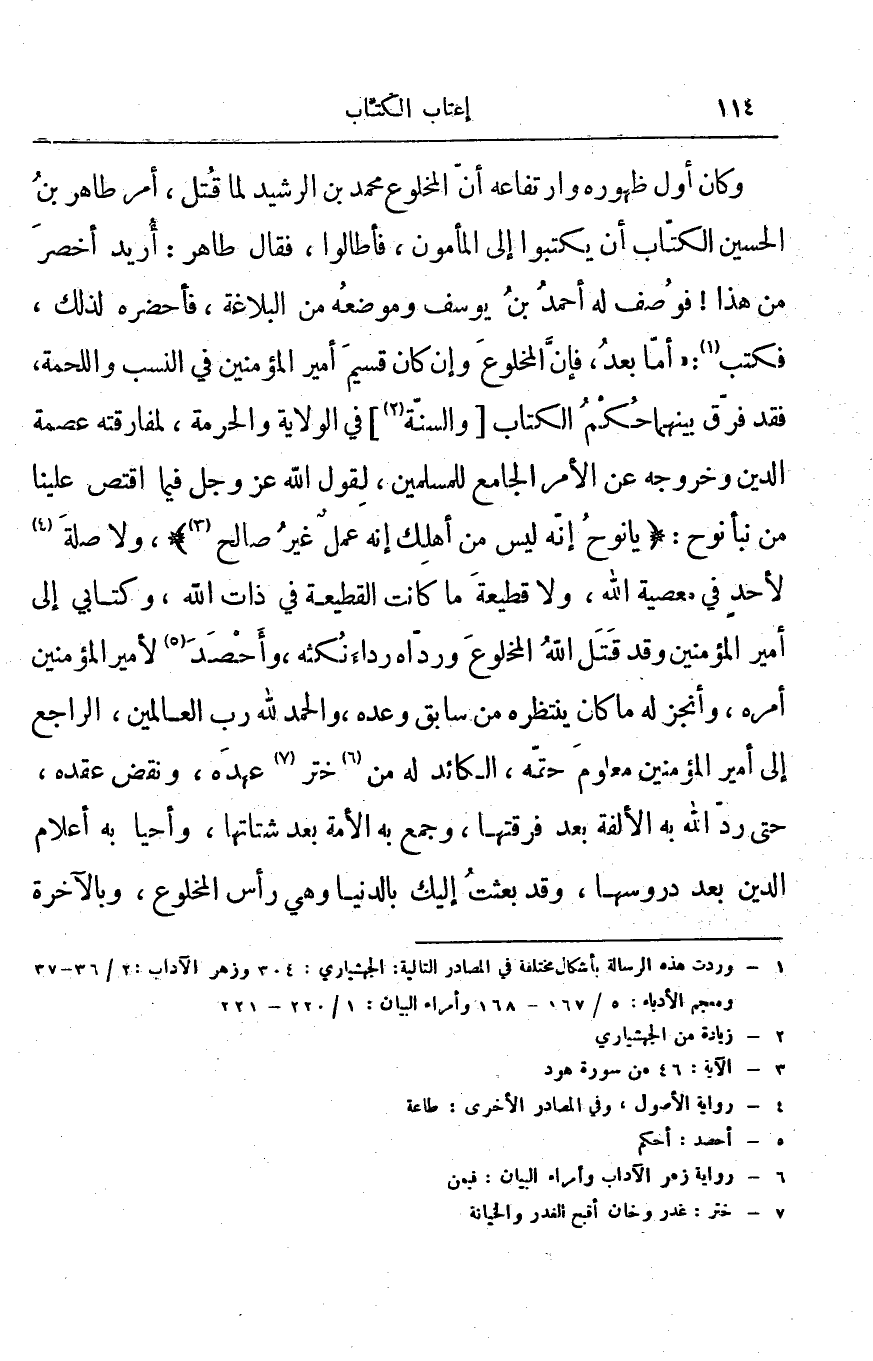 وكان أول ظهوره وارتفاعه أن المخلوع محمد بن الرشيد لما قتل، أمر طاهر بن الحسين الكتاب أن يكتبوا إلى المأمون، فأطالوا، فقال طاهر: أُريد أخصر من هذا! فوصف له أحمد بن يوسف وموضعه من البلاغة، فأحضره لذلك، فكتب: أما بعد، فإن المخلوع وإن كان قسيم أمير المؤمنين في النسب واللحمة، فقد فرق بينهما حكم الكتاب والسنة في الولاية والحرمة، لمفارقته عصمة الدين وخروجه عن الأمر الجامع للمسلمين، لقول الله عز وجل فيما اقتص علينا من نبأ نوح: " يا نوحُ إنّه ليس من أهلِك إنه عملٌ غيرُ صالح "، ولا صلة لأحد في معصية الله، ولا قطيعة ما كانت القطيعة في ذات الله، وكتابي إلى أمير المؤمنين وقد قتل الله المخلوع ورداه رداء نكثه، وأحصد لأمير المؤمنين أمره، وأنجز له ما كان ينتظره من سابق وعده، والحمد لله رب العالمين، الراجع إلى أمير المؤمنين معلوم حقه، الكائد له من ختر عهده، ونقض عقده، حتى رد الله به الألفة بعد فرقتها، وجمع به الأمة بعد شتاتها، وأحيا به أعلام الدين بعد دروسها، وقد بعثت إليك بالدنيا وهي رأس المخلوع، وبالآخرة