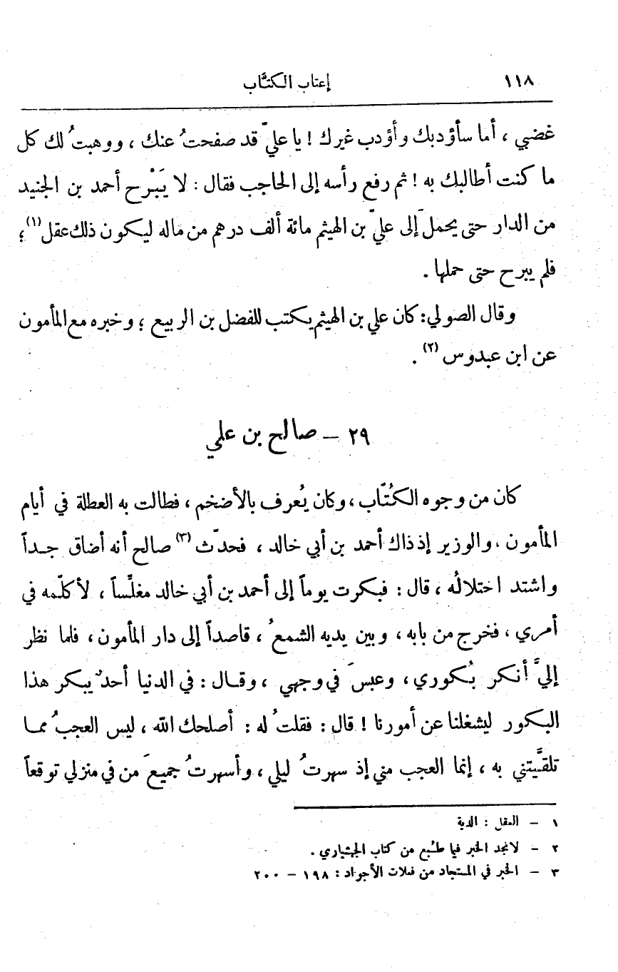 غضبي، أما سأؤدبك وأؤدب غيرك! يا علي قد صفحت عنك، ووهبت لك كل ما كنت أطالبك به! ثم رفع رأسه إلى الحاجب فقال: لا يبرح أحمد بن الجنيد من الدار حتى يحمل إلى علي بن الهيثم مائة ألف درهم من ماله ليكون ذلك عقل؛ فلم يبرح حتى حملها.
