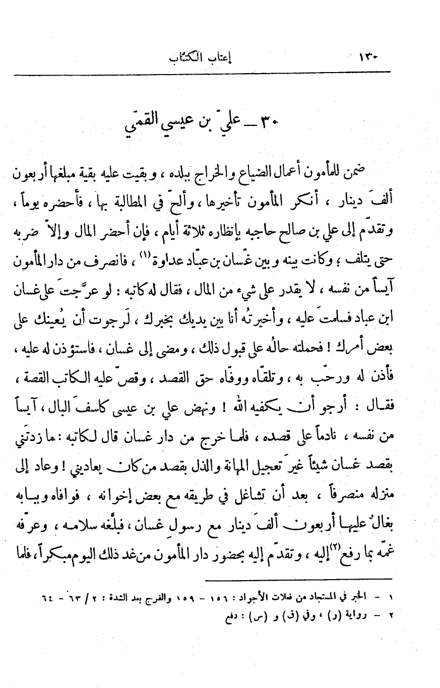 ضمن للمأمون أعمال الضياع والخراج ببلده، وبقيت عليه بقية مبلغها أربعون ألف دينار، أنكر المأمون تأخيرها، وألح في المطالبة بها، فأحضره يوماً، وتقدم إلى علي بن صالح حاجبه بإنظاره ثلاثة أيام، فإن أحضر المال وإلا ضربه حتى يتلف؛ وكانت بينه وبين غسان بن عباد عداوة، فانصرف من دار المأمون آيساً من نفسه، لا يقدر على شيء من المال، فقال له كاتبه: لو عرجت على غسان ابن عباد فسلمت عليه، وأخبرته أنا بين يديك بخبرك، لرجوت أن يعينك على بعض أمرك! فحملته حاله على قبول ذلك، ومضى إلى غسان، فاستؤذن له عليه، فأذن له ورحب به، وتلقاه ووفاه حق القصد، وقص عليه الكاتب القصة، فقال: أرجو أن يكفيه الله! ونهض علي بن عيسى كاسف البال، آيساً من نفسه، نادماً على قصده، فلما خرج من دار غسان قال لكاتبه: ما زدتني بقصد غسان شيئاً غير تعجيل المهانة والذل بقصد من كان يعاديني! وعاد إلى منزله منصرفاً، بعد أن تشاغل في طريقه مع بعض إخوانه، فوافاه وببابه بغال عليها أربعون ألف دينار مع رسول غسان، فبلغه سلامه، وعرفه غمه بما رفع إليه، وتقدم إليه بحضور دار المأمون من غد ذلك اليوم مبكراً، فلما