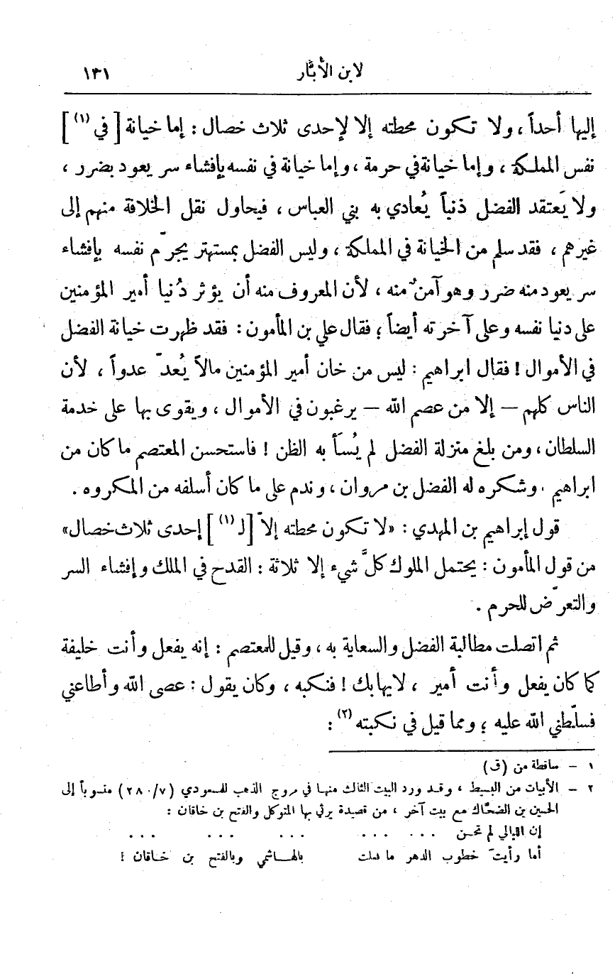 إليها أحداً، ولا تكون محطته إلا لإحدى ثلاث خصال: إما خيانة في نفس المملكة، وإما خيانة في حرمة، وإما خيانة في نفسه بإفشاء سر يعود بضرر، ولا يعتقد الفضل ذنباً يعادي به بني العباس، فيحاول نقل الخلافة منهم إلى غيرهم، فقد سلم من الخيانة في المملكة، وليس الفضل بمستهتر يجرم نفسه بإفشاء سر يعود منه ضرر وهو آمن منه، لأن المعروف منه أن يؤثر دنيا أمير المؤمنين على دنيا نفسه وعلى آخرته أيضاً؛ فقال علي بن المأمون: فقد ظهرت خيانة الفضل في الأموال! فقال إبراهيم: ليس من خان أمير المؤمنين مالاً يعد عدواً، لأن الناس كلهم إلا من عصم الله يرغبون في الأموال، ويقوى بها على خدمة السلطان، ومن بلغ منزلة الفضل لم يسأ به الظن! فاستحسن المعتصم ما كان من إبراهيم وشكره له الفضل بن مروان، وندم على ما كان أسلفه من المكروه.