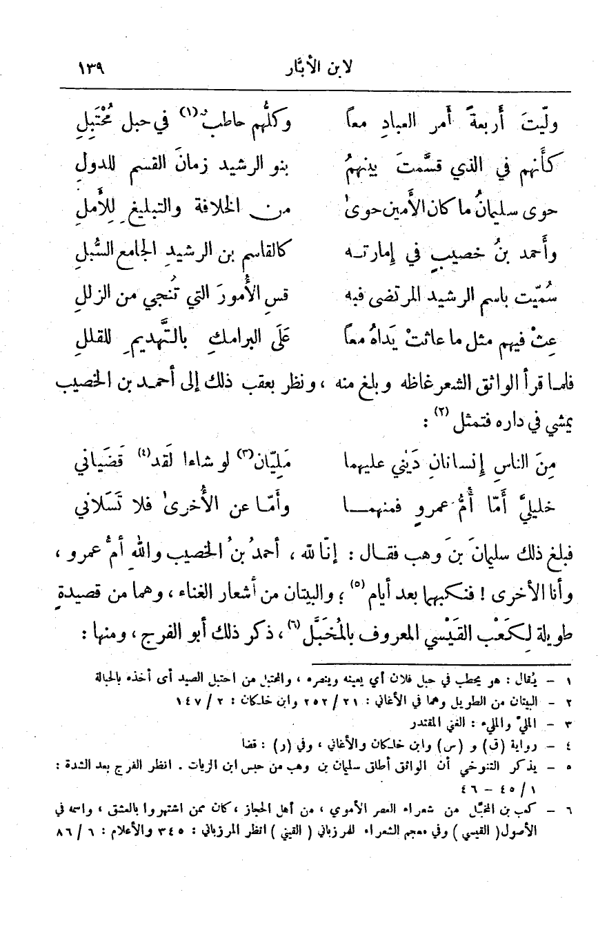 فبلغ ذلك سليمان بن وهب فقال: إنا لله، أحمد بن الخصيب والله أم عمرو، وأنا الأخرى! فنكبهما بعد أيام؛ والبيتان من أشعار الغناء، وهما من قصيدة طويلة لكعب القيسي المعروف بالمخبل، ذكر ذلك أبو الفرج، ومنها: