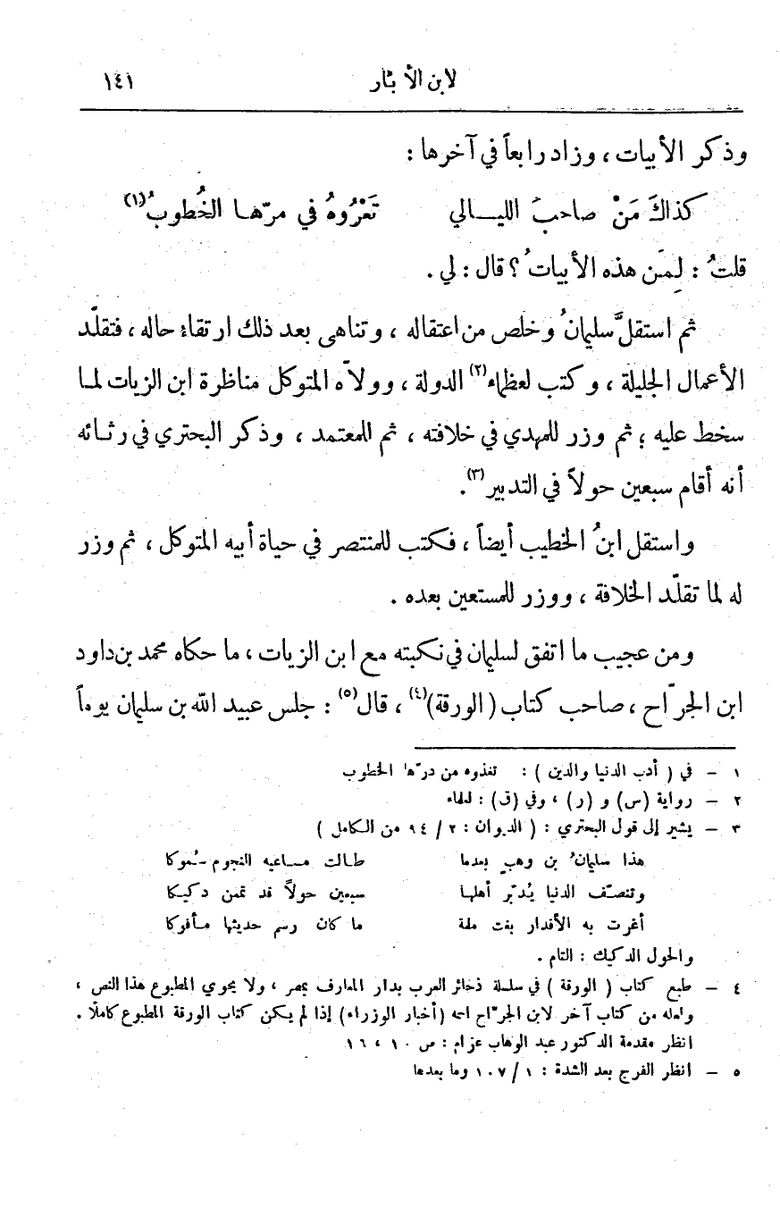 ومن عجيب ما اتفق لسليمان في نكبته مع ابن الزيات، ما حكاه محمد بن داود ابن الجراح، صاحب كتاب الورقة، قال: جلس عبيد الله بن سليمان يوماً