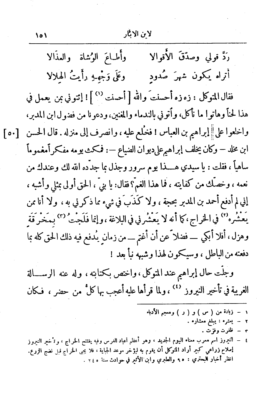فقال المتوكل: زه زه أحسنت والله أحسنت! إئتوني بمن يعمل في هذا لحناً وهاتوا ما نأكل، وأتوني بالندماء والمغنين، ودعونا من فضول ابن المدبر، واخلعوا على إبراهيم بن العباس! فخلع عليه، وانصرف إلى منزله. قال الحسن ابن مخلد وكان يخلف إبراهيم على ديوان الضياع: فمكث يومه مفكراً مغموماً ساهياً، فقلت: يا سيدي هذا يوم سرور وجذل بما جدده الله لك وعندك من نعمه، وخصك من كفايته، فما هذا الغم؟ فقال: يا بني، الحق أولى بمثلي وأشبه، إني لم أدفع أحمد بن المدبر بحجة، ولا كذب في شيء مما ذكرني به، ولا أنا ممن يعشره في الخراج، كما أنه لا يعشرني في البلاغة، وإنما فلجت بمخرقة وهزل، أفلا أبكي فضلاً عن أن أغتم من زمان يدفع فيه ذلك الحق كله بما دفعته من الباطل، وسيكون لهذا وشبهه نبأ بعد! وجلت حال إبراهيم عند المتوكل، واختص بكتابته، وله عنه الرسالة الغريبة في تأخير النيروز، ولما قرأها عليه أعجب بها كل من حضر، فكان