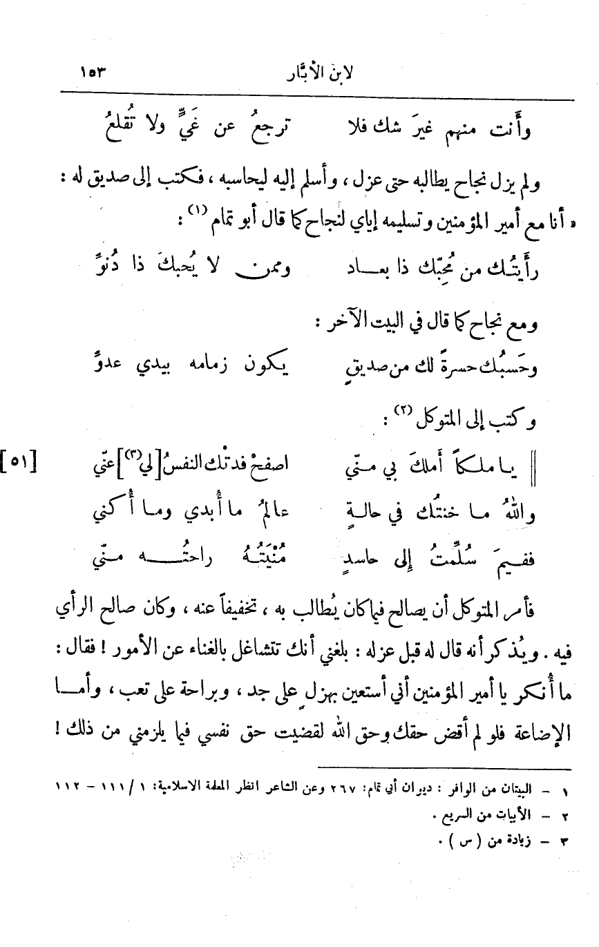ولم يزل نجاح يطالبه حتى عزل، وأسلم إليه ليحاسبه، فكتب إلى صديق له: أنا مع أمير المؤمنين وتسليمه إياي لنجاح كما قال أبو تمام: