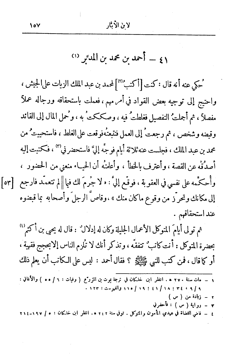 ثم تولى أيام المتوكل الأعمال الجليلة وكان له إدلال: قال له يحيى بن أكثم بحضرة المتوكل: أنت كاتب تتفقه، وتذكر أنك لا تلزم الناس إلا بحجج فقهية، أو كما قال، فمن كتب للنبي صلى الله عليه وسلم؟ فقال أحمد: ليس على الكاتب أن يعلم ذلك