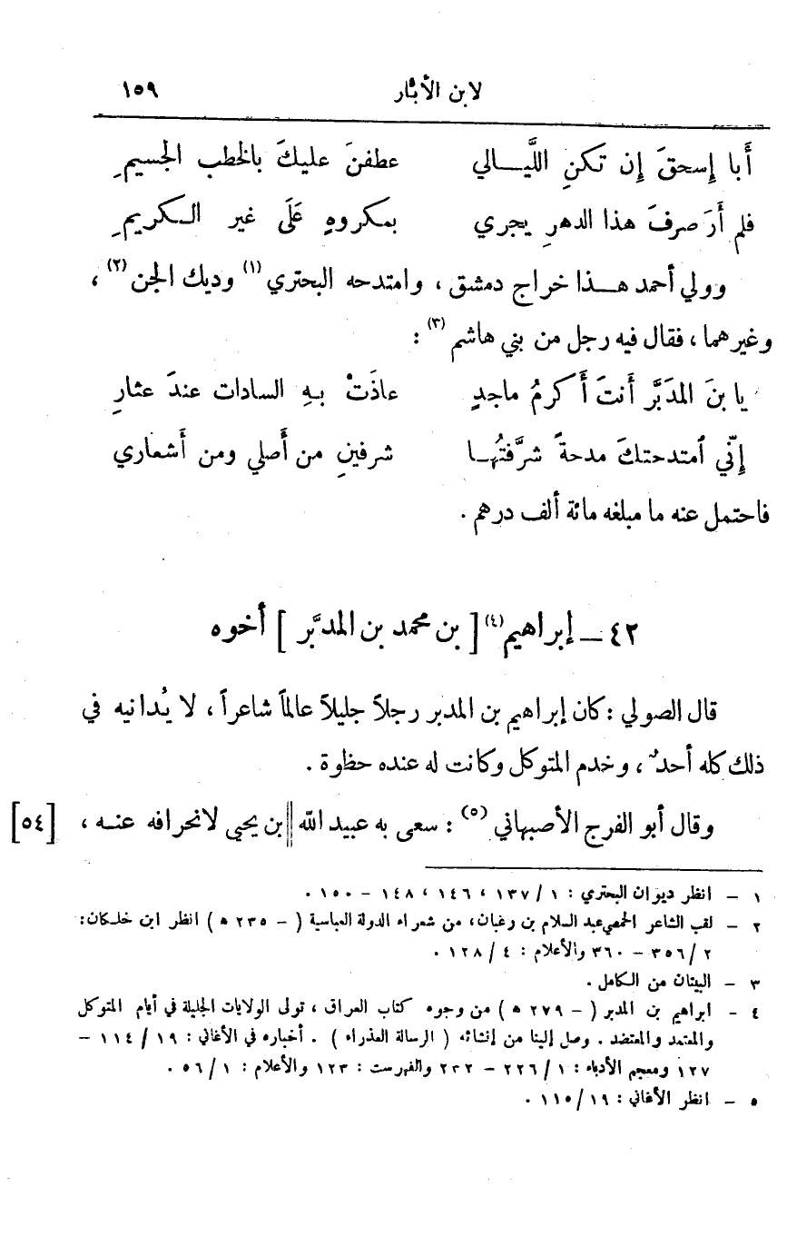 قال الصولي: كان إبراهيم بن المدبر رجلاً جليلاً عالماً شاعراً، لا يدانيه في ذلك كله أحد، وخدم المتوكل وكانت له عنده حظوة.