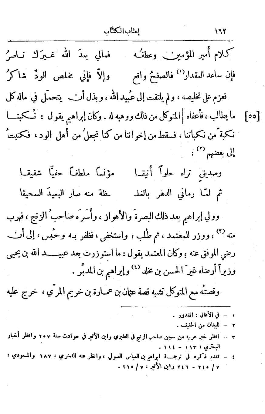 وولي إبراهيم بعد ذلك البصرة والأهواز، وأسره صاحب الزنج، فهرب منه، ووزر للمعتمد، ثم طلب، واستخفى، فظفر به وحبس، إلى أن رضي الموفق عنه؛ وكان المعتمد يقول: ما استوزرت بعد عبيد الله بن يحيى وزيراً أرضاه غير الحسن بن مخلد وإبراهيم بن المدبر.