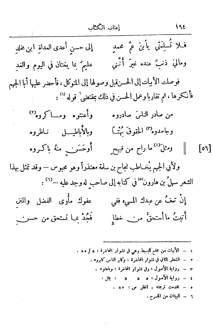 ولأبي الجهم يخاطب نجاح بن سلمة معتذراً وهو محبوس وقد تمثل بهذا الشعر سهل بن هارون في كتابه إلى صاحب له وجد عليه: