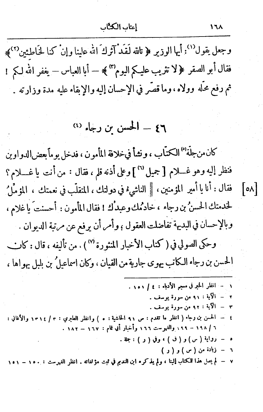 وجعل يقول: أيها الوزير " تالله لَقَدْ آثركَ الله علينا وإنْ كنا لخَاطِئين " فقال أبو الصقر " لا تثريب عليكم اليوم " أبا العباس يغفر الله لكم! ثم رفع محله وولاه، وما قصر في الإحسان إليه والإبقاء عليه مدة وزارته.