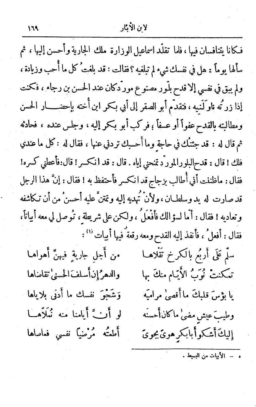 فكانا يتنافسان فيها، فلما تقلد إسماعيل الوزارة ملك الجارية وأحسن إليها، ثم سألها يوماً: هل في نفسك شيء لم تبلغيه؟ فقالت: قد بلغت كل ما أُحب وزيادة، ولم يبق في نفسي إلا قدح بلور مصنوع مورد كان عند الحسن بن رجاء، فكنت إذا زرته ناولنيه، فتقدم أبو الصقر إلى أبي بكر ابن أُخته بإحضار الحسن ومطالبته بالقدح عفواً أو عسفاً؛ فركب أبو بكر إليه، وجلس عنده، فحادثه ثم قال له: قد جئتك في حاجة وما أحسبك تردني عنها، فقال له: كل ما عندي فلك! قال: قدح البلور المورد تمنحني إياه. قال: قد انكسر! قال: فأعطني كسره! فقال: ما ظننت أني أُطالب بزجاج قد انكسر فأحتفظ به! فقال: إن هذا الرجل قد صارت له يد وسلطان، ولأن تهديه إليه وتمتن عليه أحسن من أن تكاشفه وتعاديه! فقال: أما لسؤالك فأفعل، ولكن على شريطة، توصل لي معه أبياتاً، فقال: أفعل، فأنفذ إليه القدح ومعه رقعة فيها أبيات: