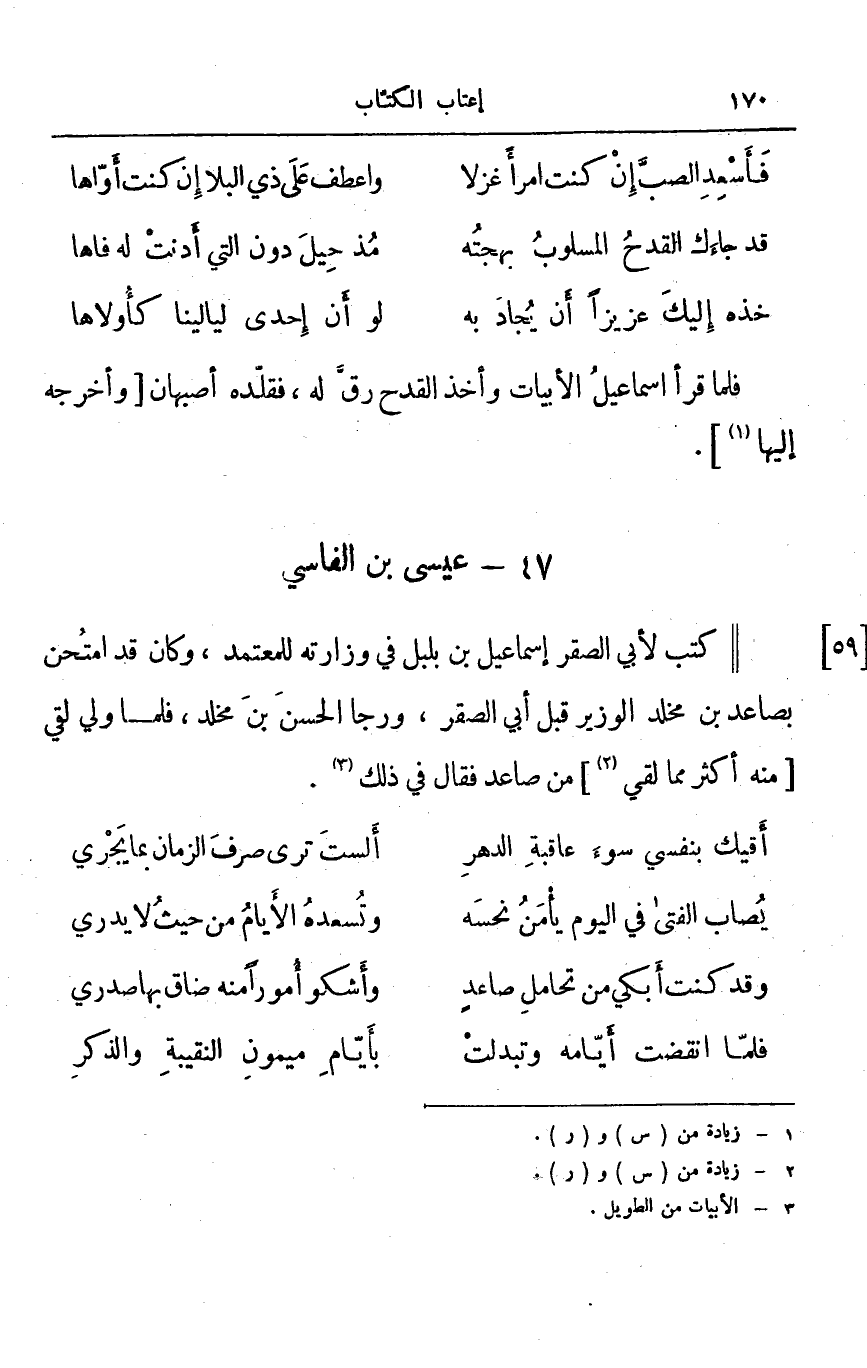 كتب لأبي الصقر إسماعيل بن بلبل في وزارته للمعتمد، وكان قد امتحن بصاعد بن مخلد الوزير قبل أبي الصقر، ورجا الحسن بن مخلد، فلما ولي لقي منه أكثر مما لقي من صاعد فقال في ذلك.