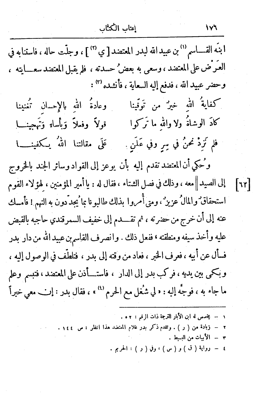 ابنه القاسم بن عبيد الله لبدر المعتضدي، وجلت حاله، فاستنابه في العرض على المعتضد، وسعى به بعض حسدته، فلم يقبل المعتضد سعايته، وحضر عبيد الله، فدفع إليه السعاية، فأنشده: