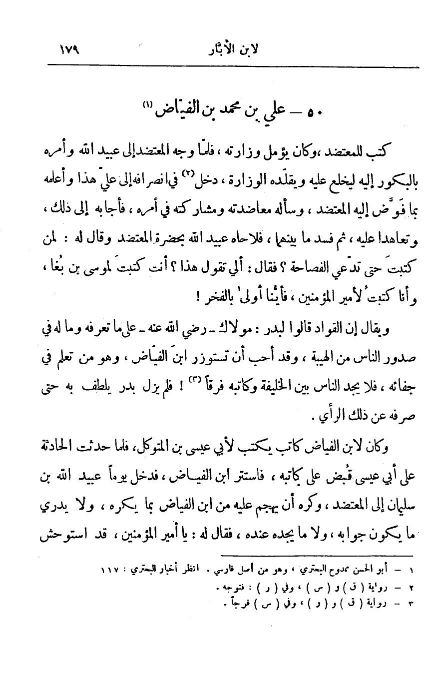 كتب للمعتضد، وكان يؤمل وزارته، فلما وجه المعتضد إلى عبيد الله وأمره بالبكور إليه ليخلع عليه ويقلده الوزارة، دخل في انصرافه إلى علي هذا وأعلمه بما فوض إليه المعتضد، وسأله معاضدته ومشاركته في أمره، فأجابه إلى ذلك، وتعاهدا عليه، ثم فسد ما بينهما، فلاحاه عبيد الله بحضرة المعتضد وقال له: لمن كتبت حتى تدعي الفصاحة؟ فقال: ألي تقول هذا؟ أنت كتبت لموسى بن بغا، وأنا كتبت لأمير المؤمنين، فأينا أولى بالفخر! ويقال إن القواد قالوا لبدر: مولاك رضي الله عنه على ما تعرفه وماله في صدور الناس من الهيبة، وقد أحب أن تستوزر ابن الفياض، وهو من تعلم في جفائه، فلا يجد الناس بين الخليفة وكاتبه فرقاً! فلم يزل بدر يلطف به حتى صرفه عن ذلك الرأي.