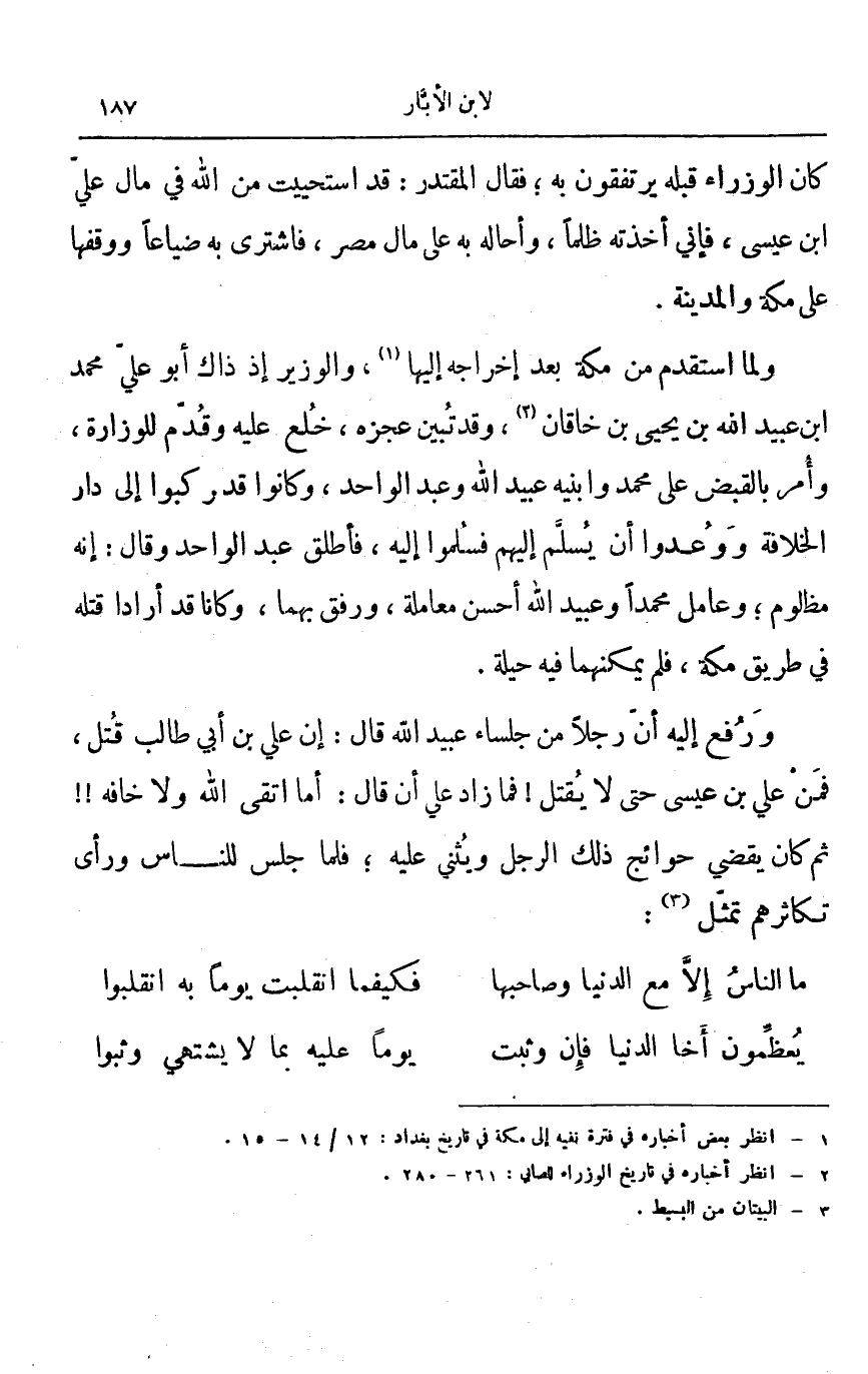 ورفع إليه أن رجلاً من جلساء عبيد الله قال: إن علي بن أبي طالب قتل، فمن علي بن عيسى حتى لا يقتل! فما زاد علي أن قال: أما اتقى الله ولا خافه!! ثم كان يقضي حوائج ذلك الرجل ويثني عليه؛ فلما جلس للناس ورأى تكاثرهم تمثل: