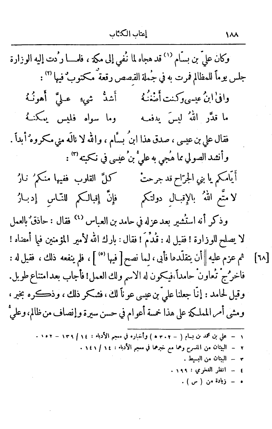 وكان علي بن بسام قد هجاه لما نفي إلى مكة، فلما ردت إليه الوزارة جلس يوماً للمظالم فمرت به في جملة القصص رقعة مكتوب فيها: