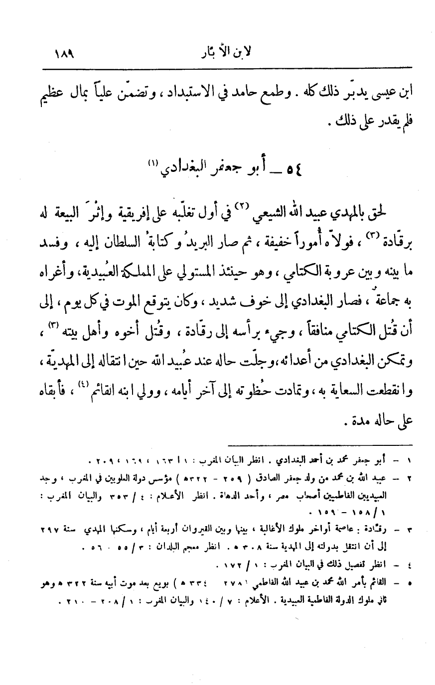 لحق بالمهدي عبيد الله الشيعي في أول تغلبه على إفريقية وإثر البيعة له برقادة، فولاه أُموراً خفيفة، ثم صار البريد وكتابة السلطان إليه، وفسد ما بينه وبين عروبة الكتامي، وهو حينئذ المستولي على المملكة العبيدية، وأغراه به جماعة، فصار البغدادي إلى خوف شديد، وكان يتوقع الموت في كل يوم، إلى أن قتل الكتامي منافقاً، وجيء برأسه إلى رقادة، وقتل أخوه وأهل بيته، وتمكن البغدادي من أعدائه، وجلت حاله عند عبيد الله حين انتقاله إلى المهدية، وانقطعت السعاية به، وتمادت حظوته إلى آخر أيامه، وولي ابنه القائم، فأبقاه على حاله مدة.