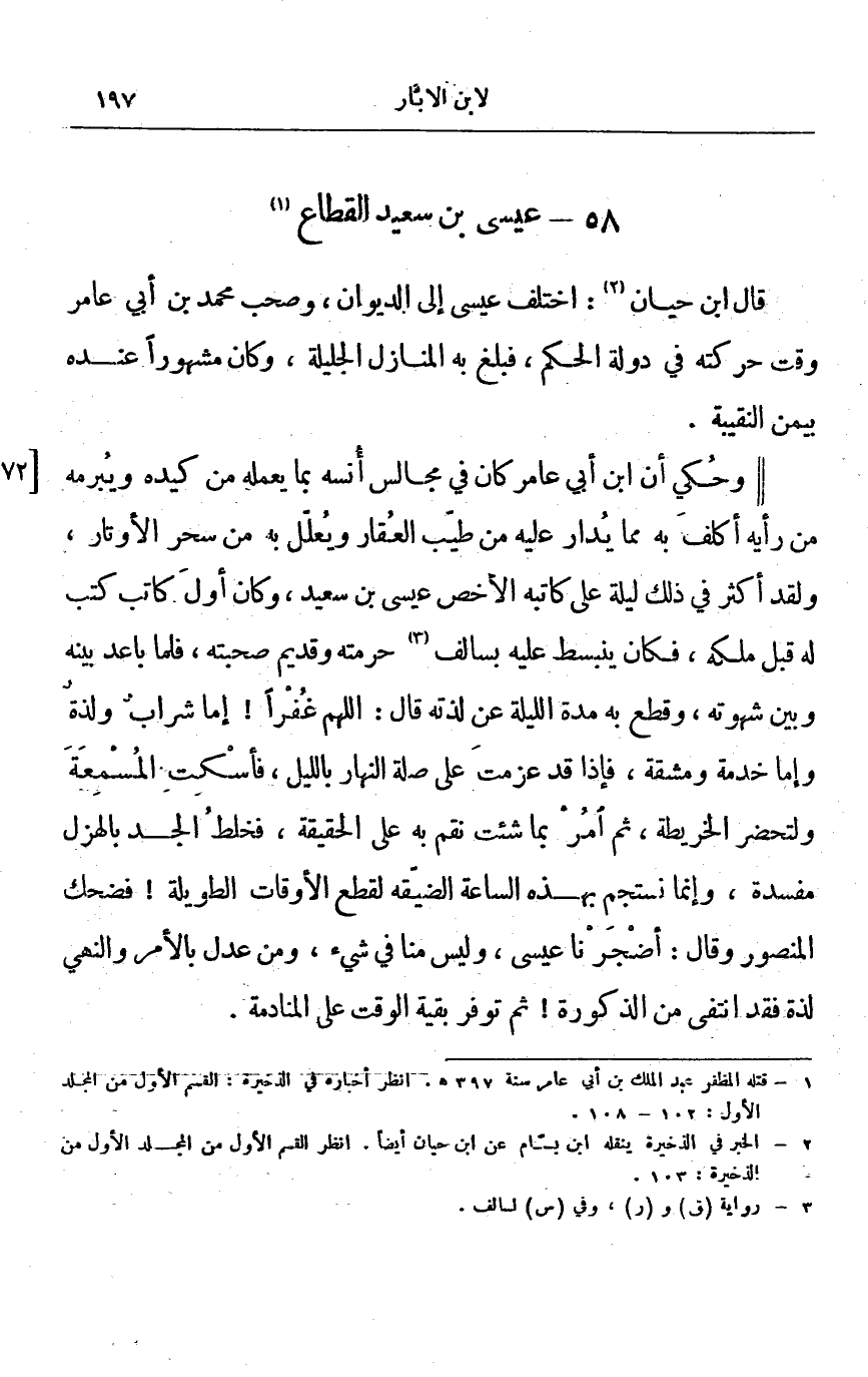 وحكي أن ابن أبي عامر كان في مجالس أُنسه بما يعمله من كيده ويبرمه من رأيه أكلف به مما يدار عليه من طيب العقار ويعلل به من سحر الأوتار، ولقد اكثر في ذلك ليلة على كاتبه الأخص عيسى بن سعيد، وكان أول كاتب كتب له قبل ملكه، فكان ينبسط عليه بسالف حرمته وقديم صحبته، فلما باعد بينه وبين شهوته، وقطع به مدة الليلة عن لذته قال: اللهم غفراً! إما شراب ولذة وإما خدمة ومشقة، فإذا قد عزمت على صلة النهار بالليل، فأسكت المسمعة ولتحضر الخريطة، ثم أمر بما شئت نقم به على الحقيقة، فخلط الجد بالهزل مفسدة، وإنما نستجم بهذه الساعة الضيقه لقطع الأوقات الطويلة! فضحك المنصور وقال: أضجرنا عيسى، وليس منا في شيء، ومن عدل بالأمر والنهي لذة فقد انتفى من الذكورة! ثم توفر بقية الوقت على المنادمة.