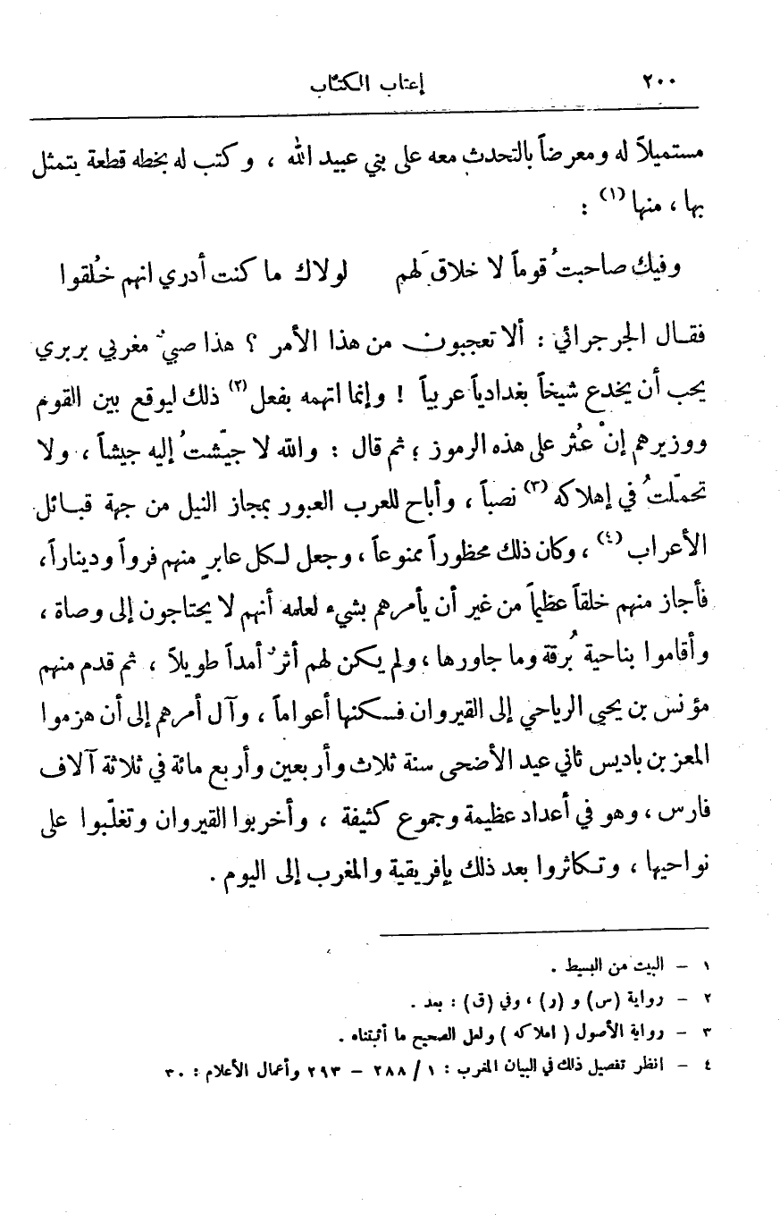 فقال الجرجرائي: ألا تعجبون من هذا الأمر؟ هذا صبي مغربي بربري يحب أن يخدع شيخاً بغدادياً عربياً! وإنما اتهمه بفعل ذلك ليوقع بين القوم ووزيرهم إن عثر على هذه الرموز؛ ثم قال: والله لا جيشت إليه جيشاً، ولا تحملت في إهلاكه نصباً، وأباح للعرب العبور بمجاز النيل من جهة قبائل الأعراب، وكان ذلك محظوراً ممنوعاً، وجعل لكل عابر منهم فرواً وديناراً، فأجاز منهم خلقاً عظيماً من غير أن يأمرهم بشيء لعلمه أنهم لا يحتاجون إلى وصاة، وأقاموا بناحية برقة وما جاورها، ولم يكن لهم أثر أمداً طويلاً، ثم قدم منهم مؤنس بن يحيى الرياحي إلى القيروان فسكنها أعواماً، وآل أمرهم إلى أن هزموا المعز بن باديس ثاني عيد الأضحى سنة ثلاث وأربعين وأربع مائة في ثلاثة آلاف فارس، وهو في أعداد عظيمة وجموع كثيفة، وأخربوا القيروان وتغلبوا على نواحيها، وتكاثروا بعد ذلك بإفريقية والمغرب إلى اليوم.