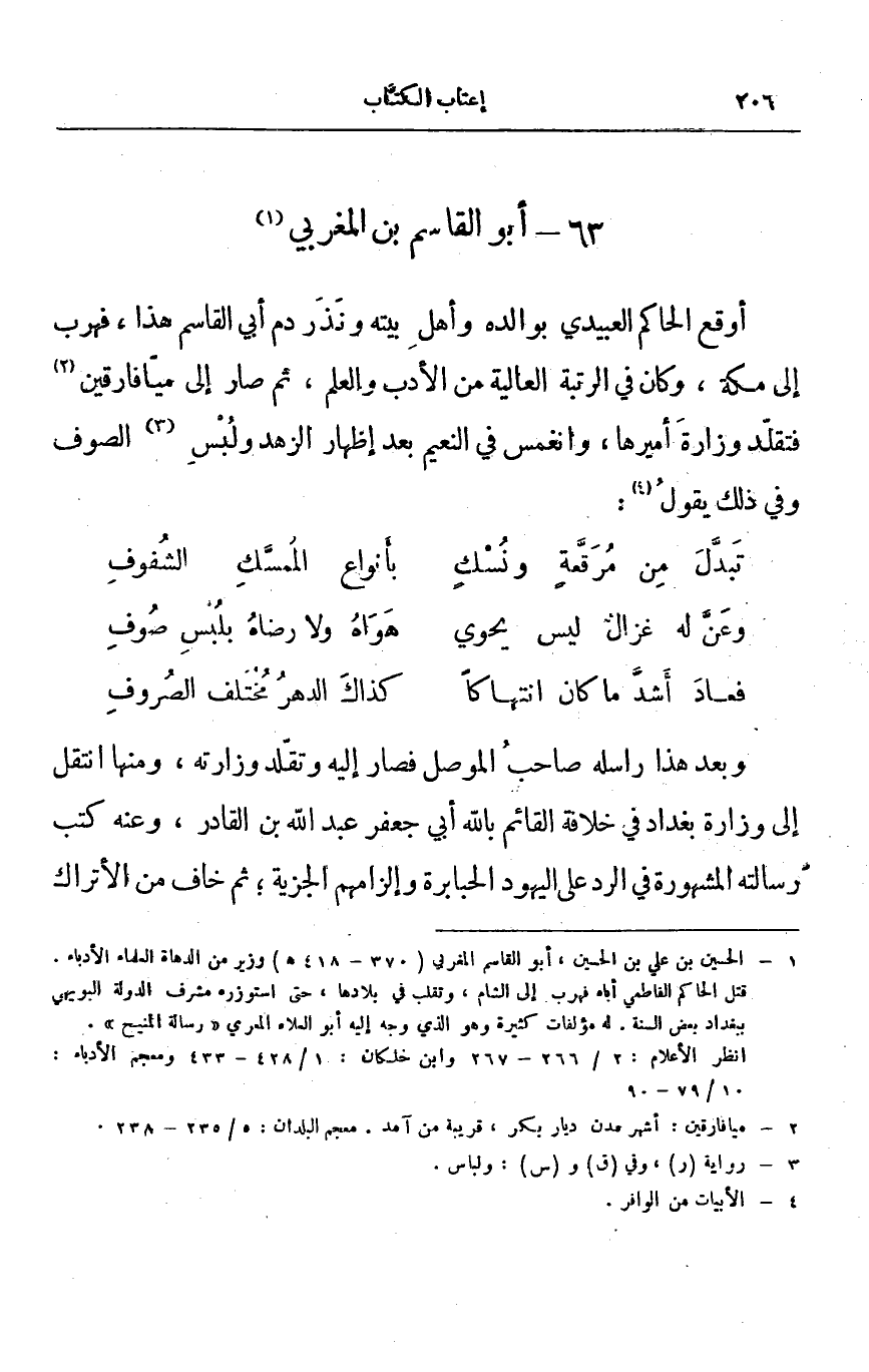 وبعد هذا راسله صاحب الموصل فصار إليه وتقلد وزارته، ومنها انتقل إلى وزارة بغداد في خلافة القائم بالله أبي جعفر عبد الله بن القادر، وعنه كتب رسالته المشهورة في الرد على اليهود الحبابرة وإلزامهم الجزية؛ ثم خاف من الأتراك