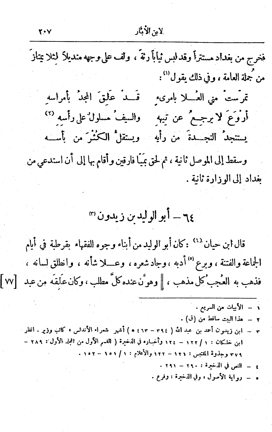 قال ابن حيان: كان أبو الوليد من أبناء وجوه الفقهاء بقرطبة في أيام الجماعة والفتنة، وبرع أدبه، وجاد شعره، وعلا شأنه، وانطلق لسانه، فذهب به العجب كل مذهب، وهون عنده كل مطلب، وكان علقه من عبد