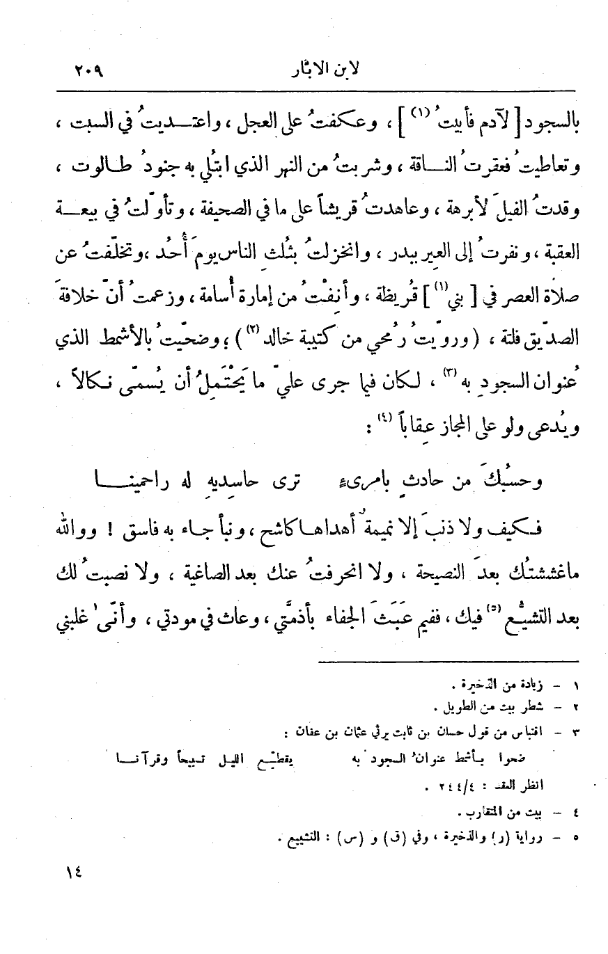 بالسجود لآدم فأبيت، وعكفت على العجل، واعتديت في السبت، وتعاطيت فعقرت الناقة، وشربت من النهر الذي ابتلي به جنود طالوت، وقدت الفيل لأبرهة، وعاهدت قريشاً على ما في الصحيفة، وتأولت في بيعة العقبة، ونفرت إلى العير ببدر، وانخزلت بثلث الناس يوم أُحد، وتخلفت عن صلاة العصر في بني قريظة، وأنفت من إمارة أُسامة، وزعمت أن خلافة الصديق فلتة، ورويت رمحي من كتيبة خالد؛ وضحيت بالأشمط الذي عنوان السجود به، لكان فيما جرى علي ما يحتمل أن يسمى نكالاً، ويدعى ولو على المجاز عقاباً: