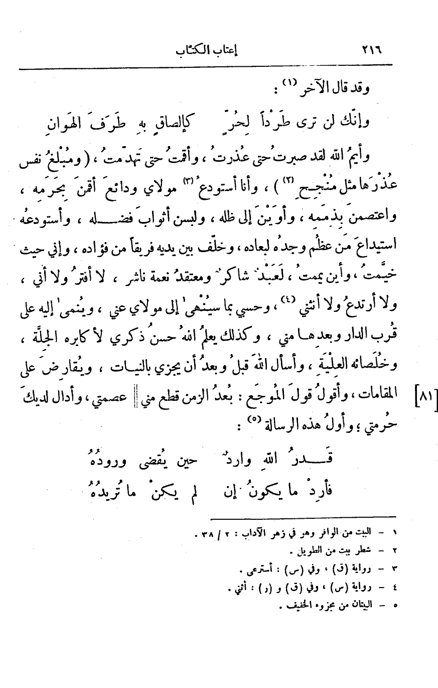 وأيم الله لقد صبرت حتى عذرت، وأقمت حتى تهدمت، ومبلغ نفس عذرها مثل منجح، وأنا أستودع مولاي ودائع أقمن بحرمه، واعتصمن بذممه، وأوين إلى ظله، ولبسن أثواب فضله، وأستودعه استيداع من عظم وجده لبعاده، وخلف بين يديه فريقاً من فؤاده، وإني حيث خيمت، وأين يممت، لعبد شاكر ومعتقد نعمة ناشر، لا أفتر ولا اني، ولا أرتدع ولا أنثني، وحسبي بما سينهى إلى مولاي عني، وينمى إليه على قرب الدار وبعدها مني، وكذلك يعلم الله حسن ذكري لأكابره الجلة، وخلصائه العلية، وأسأل الله قبل وبعد أن يجزي بالنيات، ويقارض على المقامات، وأقول قول الموجع: بعد الزمن قطع مني عصمتي، وأدال لديك حرمتي؛ وأول هذه الرسالة: