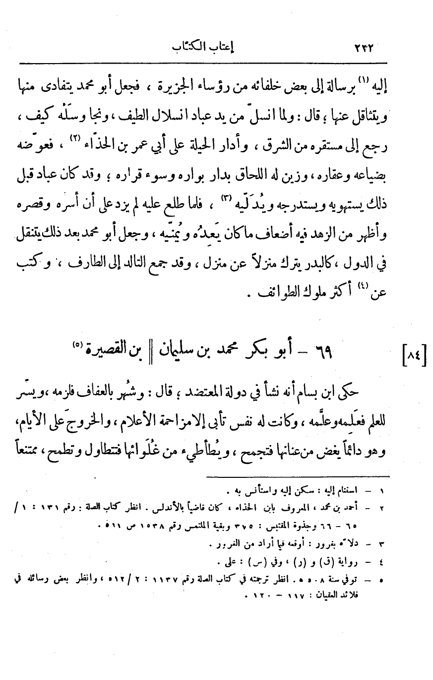إليه برسالة إلى بعض خلفائه من رؤساء الجزيرة، فجعل أبو محمد يتفادى منها ويتثاقل عنها؛ قال: ولما انسل من يد عباد انسلال الطيف، ونجا وسله كيف، رجع إلى مستقره من الشرق، وأدار الحيلة على أبي عمر بن الحذاء، فعوضه بضياعه وعقاره، وزين له اللحاق بدار بواره وسوء قراره؛ وقد كان عباد قبل ذلك يستهويه ويستدرجه ويدليه، فلما طلع عليه لم يزد على أن اسره وقصره وأظهر من الزهد فيه أضعاف ما كان يعده ويمنيه، وجعل أبو محمد بعد ذلك يتنقل في الدول، كالبدر يترك منزلاً عن منزل، وقد جمع التالد إلى الطارف، وكتب عن أكثر ملوك الطوائف.