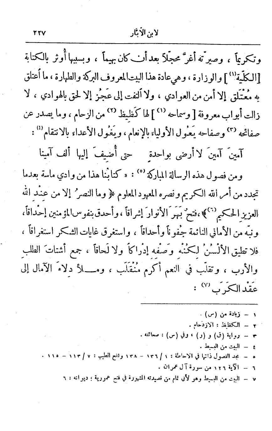 وتكريماً، وصيرته أغر محجلاً بعد أن كان بهيماً، وبسببها أُوثر بالكتابة الكلية والوزارة، وهي عادة هذا البيت المعروف البركة والطهارة، ما أعتلق به معتلق إلا أمن من العوادي، ولا ألتفت إلى عجز إلا لحق بالهوادي، لا زالت أبواب معروفة وسماحه لها كظيظ من الزحام، وما يصدر عن صفائحه وصفاحه يعول الأولياء بالإنعام، ويغول الأعداء بالانتقام: