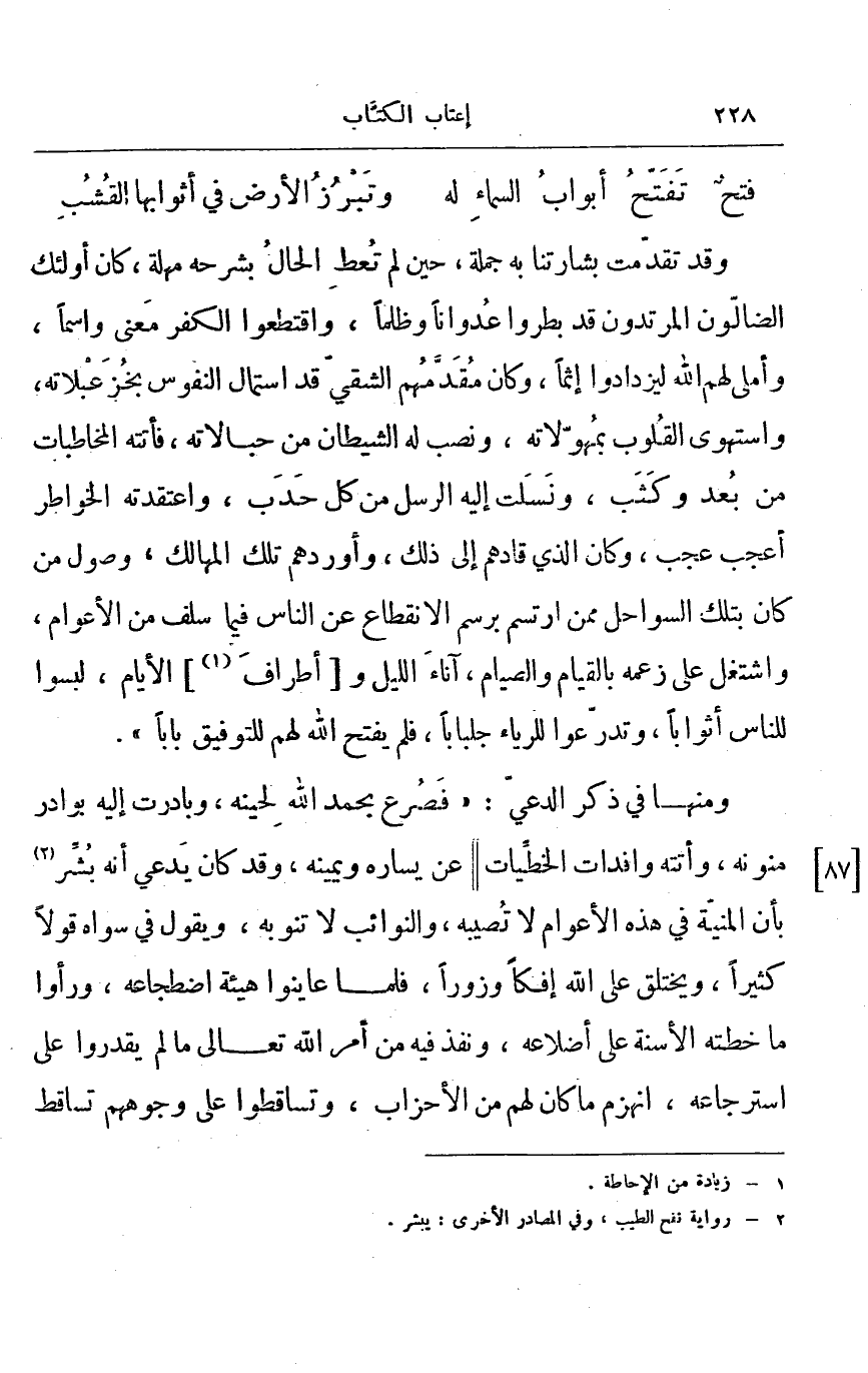 ومنها في ذكر الدعي: فصرع بحمد الله لحينه، وبادرت إليه بوادر منونه، وأتته وافدات الخطيات عن يساره ويمينه، وقد كان يدعي أنه بشر بأن المنية في هذه الأعوام لا تصيبه، والنوائب لا تنوبه، ويقول في سواه قولاً كثيراً، ويختلق على الله إفكاً وزوراً، فلما عاينوا هيئة اضطجاعه، ورأوا ما خطته الأسنة على أضلاعه، ونفذ فيه من أمر الله تعالى ما لم يقدروا على استرجاعه، انهزم ما كان لهم من الأحزاب، وتساقطوا على وجوههم تساقط