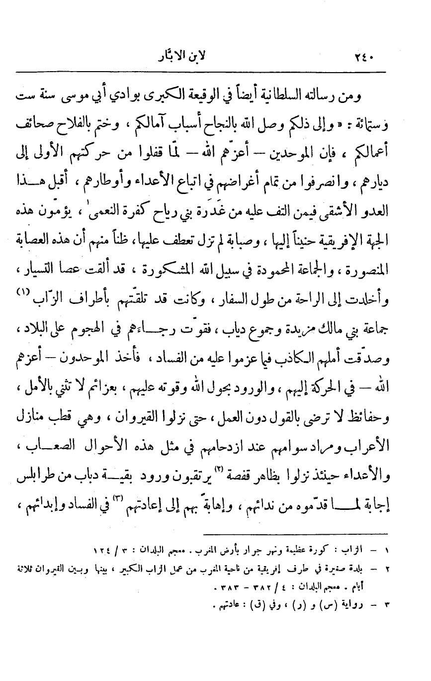ومن رسالته السلطانية أيضاً في الوقيعة الكبرى بوادي أبي موسى سنة ست وستمائة: وإلى ذلكم وصل الله بالنجاح أسباب آمالكم، وختم بالفلاح صحائف أعمالكم، فإن الموحدين أعزهم الله لما قفلوا من حركتهم الأولى إلى ديارهم، وانصرفوا من تمام أغراضهم في اتباع الأعداء وأوطارهم، أقبل هذا العدو الأشقى فيمن التف عليه من غدرة بني رياح كفرة النعمى، يؤمون هذه الجهة الإفريقية حنيناً إليها، وصبابة لم تزل تعطف عليها، ظناً منهم أن هذه العصابة المنصورة، والجماعة المحمودة في سبيل الله المشكورة، قد ألقت عصا التسيار، وأخلدت إلى الراحة من طول السفار، وكانت قد تلقتهم بأطراف الزاب جماعة بني مالك مزيدة وجموع دياب، فقوت رجاءهم في الهجوم على البلاد، وصدقت أملهم الكاذب فيما عزموا عليه من الفساد، فأخذ الموحدون أعزهم الله في الحركة إليهم، والورود بحول الله وقوته عليهم، بعزائم لا تثني بالأمل، وحفائظ لا ترضى بالقول دون العمل، حتى نزلوا القيروان، وهي قطب منازل الأعراب ومراد سوامهم عند ازدحامهم في مثل هذه الأحوال الصعاب، والأعداء حينئذ نزلوا بظاهر قفصة يرتقبون ورود بقية دباب من طرابلس إجابة لما قدموه من ندائهم، وإهابةً بهم إلى إعادتهم في الفساد وإبدائهم،