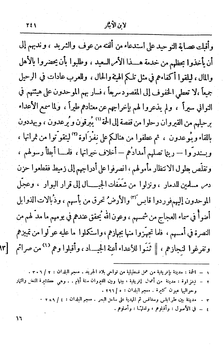 وأقبلت عصابة التوحيد على استدعاء من ألفته من عوف والشريد، وندبهم إلى أن يأخذوا بحظهم من خدمة هذا الأمر السعيد، وطلبوا بأن يحضروا بالأهل والمال، ليلقوا أكفاءهم في مثل تلكم الهيئة والحال، وللعرب عادات في الرحيل جميعاً، لا تعطي الخفوف إلى المقصود سريعاً، فسار بهم الموحدون على هيئتهم في التواني سيراً، ولم يذعروا لهم بإخراجهم عن معتادهم طيراً، ولما سمع الأعداء برحيلهم من القيروان رحلوا من قفصة إلى الحمة يبرقون ويرعدون، ويهددون باللقاء ويوعدون، ثم عطفوا من هنالكم على نفزاوة ليتقوتوا من ثمراتها، ويستدروا ريثما تصلهم أمدادهم أخلاف خيراتها، فلما أبطأ رسولهم، وتقلص بطول الانتظار مأمولهم، انصرفوا على أدراجهم إلى زميط فقطعوا حزن دمر مسلمين للدمار، ونزلوا من شعفات الجبال إلى قرار البوار، وعجل الموحدون إليهم فوردوا قابس والأرض تحرق من بأسهم، وذبالات الذوابل أضوأُ في سماء العجاج من شمسهم، وعون الله يحقق عندهم في يومهم ما مد لهم من النصرة في أمسهم، فلما تجهزوا منها بجهازهم، واستكملوا ما عليه عولوا من تمييزهم وتفرغوا لنجازهم، ثنوا للأعداء أعنة الجياد، وأقبلوا وهم من صرائم