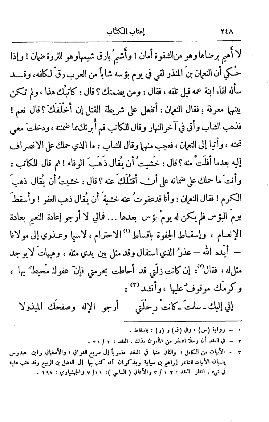 لا أهيم برضاها وهو من الشقوة أمان! وأشيم بارق شيمها وهو للثروة ضمان! وإذا حكي أن النعمان بن المنذر لقي في يوم بؤسه شاباً من العرب رق لكلفه، وقد سأله لقاء ابنة عمه قبل تلفه، فقال: ومن يضمنك؟ قال: كاتبك هذا، ولم تكن بينهما معرفة؛ فقال النعمان: أتفعل على شريطة القتل إن أخلفك؟ قال نعم! فذهب الشاب وأتى في آخر النهار وقال للكاتب قم أُبرئك مما ضمنته، ودخلت معي تحته، وأتيا إلى النعمان، فعجب منهما وقال للشاب: ما الذي حملك على الانصراف إليه بعد ما أفلت منه؟ قال: خشيت أن يقال ذهب الوفاء! ثم قال للكاتب: وأنت ما حملك على ضمانه على أن أقتلك عنه؟ قال: خشيت أن يقال ذهب الكرم! فقال النعمان: وأنا قد عفوت عنه خشية أن يقال ذهب العفو! وأسقط يوم البؤس فلم يكن له يوم بؤس بعدها ... فمالي لا أرجو إعادة النعيم بعادة الإنعام، وإسقاط الجفوة باقساط الاحترام، لا سيما وعذري إلى مولانا أيده الله عذر الذي استقال وقد مثل بين يدي مثله، وهيهات لا يوجد مثل له، فقال: إن كانت زلتي قد أحاطت بحرمتي فإن عفوك محيط بها، وكرمك موقوف عليها، وأنشد: