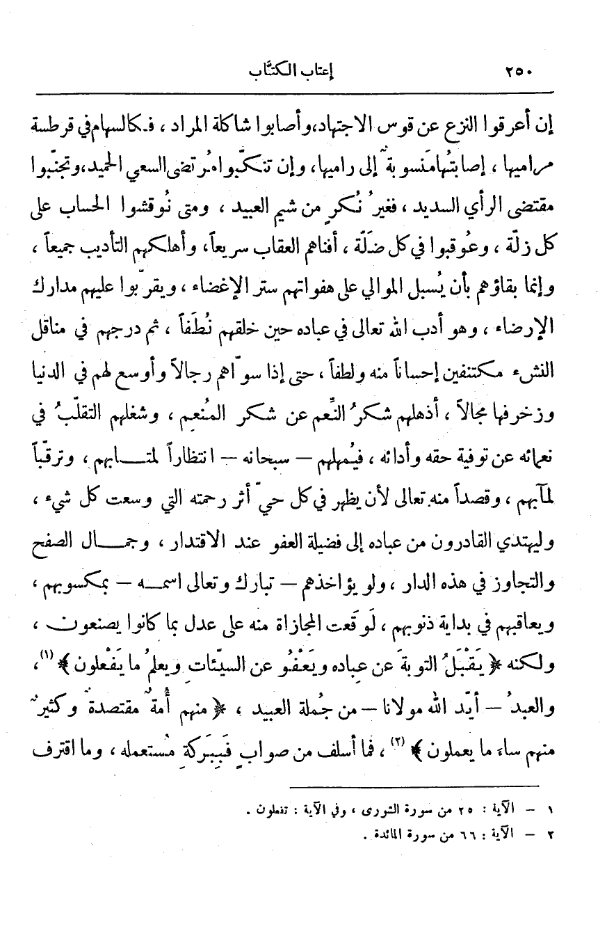 إن أعرقوا النزع عن قوس الاجتهاد، وأصابوا شاكلة المراد، فكالسهام في قرطسة مراميها، إصابتها منسوبة إلى راميها، وإن تنكبوا مرتضى السعي الحميد، وتجنبوا مقتضى الرأي السديد، فغير نكر من شيم العبيد، ومتى نوقشوا الحساب على كل زلة، وعوقبوا في كل ضلة، أفناهم العقاب سريعاً، وأهلكهم التأديب جميعاً، وإنما بقاؤهم بأن يسبل الموالي على هفواتهم ستر الإغضاء، ويقربوا عليهم مدارك الإرضاء، وهو أدب الله تعالى في عباده حين خلقهم نطفاً، ثم درجهم في مناقل النشء مكتنفين إحساناً منه ولطفاً، حتى إذا سواهم رجالاً وأوسع لهم في الدنيا وزخرفها مجالاً، أذهلهم شكر النعم عن شكر المنعم، وشغلهم التقلب في نعمائه عن توفية حقه وأدائه، فيمهلهم سبحانه انتظاراً لمتابهم، وترقباً لمآبهم، وقصداً منه تعالى لأن يظهر في كل حي أثر رحمته التي وسعت كل شيء، وليهتدي القادرون من عباده إلى فضيلة العفو عند الاقتدار، وجمال الصفح والتجاوز في هذه الدار، ولو يؤاخذهم تبارك وتعالى اسمه بمكسوبهم، ويعاقبهم في بداية ذنوبهم، لوقعت المجازاة منه على عدل بما كانوا يصنعون، ولكنه " يَقْبَلُ التوبةَ عن عِباده ويَعْفُو عن السيّئاتِ ويعلمُ ما يَفْعلون "، والعبد أيد الله مولانا من جملة العبيد، " منهم أُمةٌ مقتصدةٌ وكثيرٌ منهم ساء ما يعملون "، فما أسلف من صواب فببركة مستعمله، وما اقترف