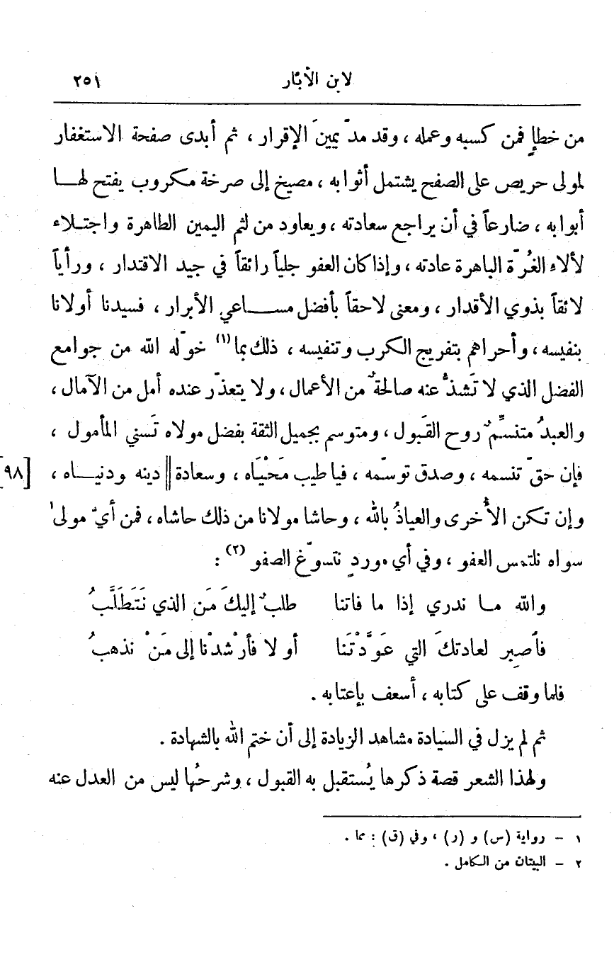 من خطإ فمن كسبه وعمله، وقد مد يمين الإقرار، ثم أبدى صفحة الاستغفار لمولى حريص على الصفح يشتمل أثوابه، مصيخ إلى صرخة مكروب يفتح لها أبوابه، ضارعاً في أن يراجع سعادته، ويعاود من لثم اليمين الطاهرة واجتلاء لألاء الغرة الباهرة عادته، وإذا كان العفو جلياً رائقاً في جيد الاقتدار، ورأياً لائقاً بذوي الأقدار، ومعنى لاحقاً بأفضل مساعي الأبرار، فسيدنا أولانا بنفيسه، وأحراهم بتفريج الكرب وتنفيسه، ذلك بما خوله الله من جوامع الفضل الذي لا تشذ عنه صالحة من الأعمال، ولا يتعذر عنده أمل من الآمال، والعبد متنسم روح القبول، ومتوسم بجميل الثقة بفضل مولاه تسني المأمول، فإن حق تنسمه، وصدق توسمه، فيا طيب محياه، وسعادة دينه ودنياه، وإن تكن الأُخرى والعياذ بالله، وحاشا مولانا من ذلك حاشاه، فمن أي مولى سواه نلتمس العفو، وفي أي مورد نتسوغ الصفو: