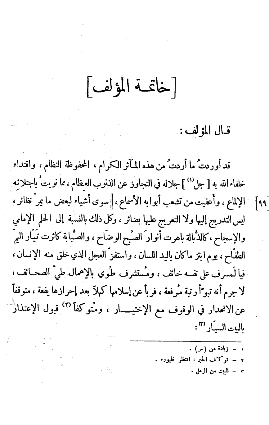 قال المؤلف: قد أوردت ما أردت من هذه المآثر الكرام، المحفوظة النظام، واقتداء خلفاء الله به جل جلاله في التجاوز عن الذنوب العظام، مما نويت باجتلائه الإلماع، وأعفيت من تشعب أبوابه الأسماع، سوى أشياء لبعض ما يمر نظائر، ليس التدريج إليها ولا التعريج عليها بضائر، وكل ذلك بالنسبة إلى الحلم الإمامي والإسجاح، كالذبالة باهرت أنوار الصبح الوضاح، والصبابة كاثرت تيار اليم الطفاح، يوم ابتز ما كان باليد اللسان، واستفز العجل الذي خلق منه الإنسان، فيالمسرف على نفسه خائف، ومستشرف طوي بالإهمال طي الصحائف، لا جرم أنه تبوأ رتبة مرفعة، فربأ عن إسلامها كهلاً بعد إحرازها يفعة، متوقفاً عن الانحدار في الوقوف مع الإختيار، ومتوكفاً قبول الإعتذار بالبيت السيار: