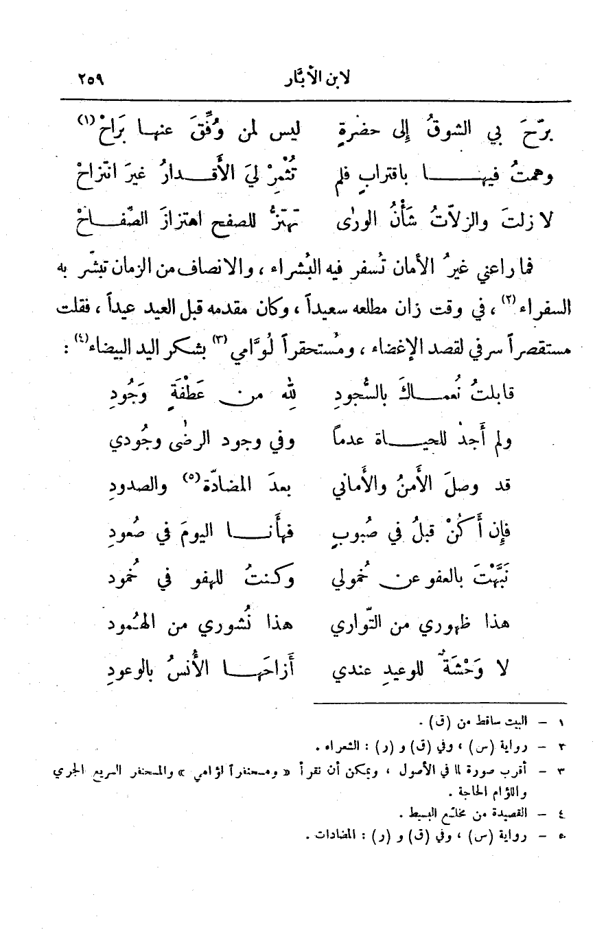 فما راعني غير الأمان تسفر فيه البشراء، والانصاف من الزمان تبشر به السفراء، في وقت زان مطلعه سعيداً، وكان مقدمه قبل العيد عيداً، فقلت مستقصراً سرفي لقصد الإغضاء، ومستحقراً لوامي بشكر اليد البيضاء: