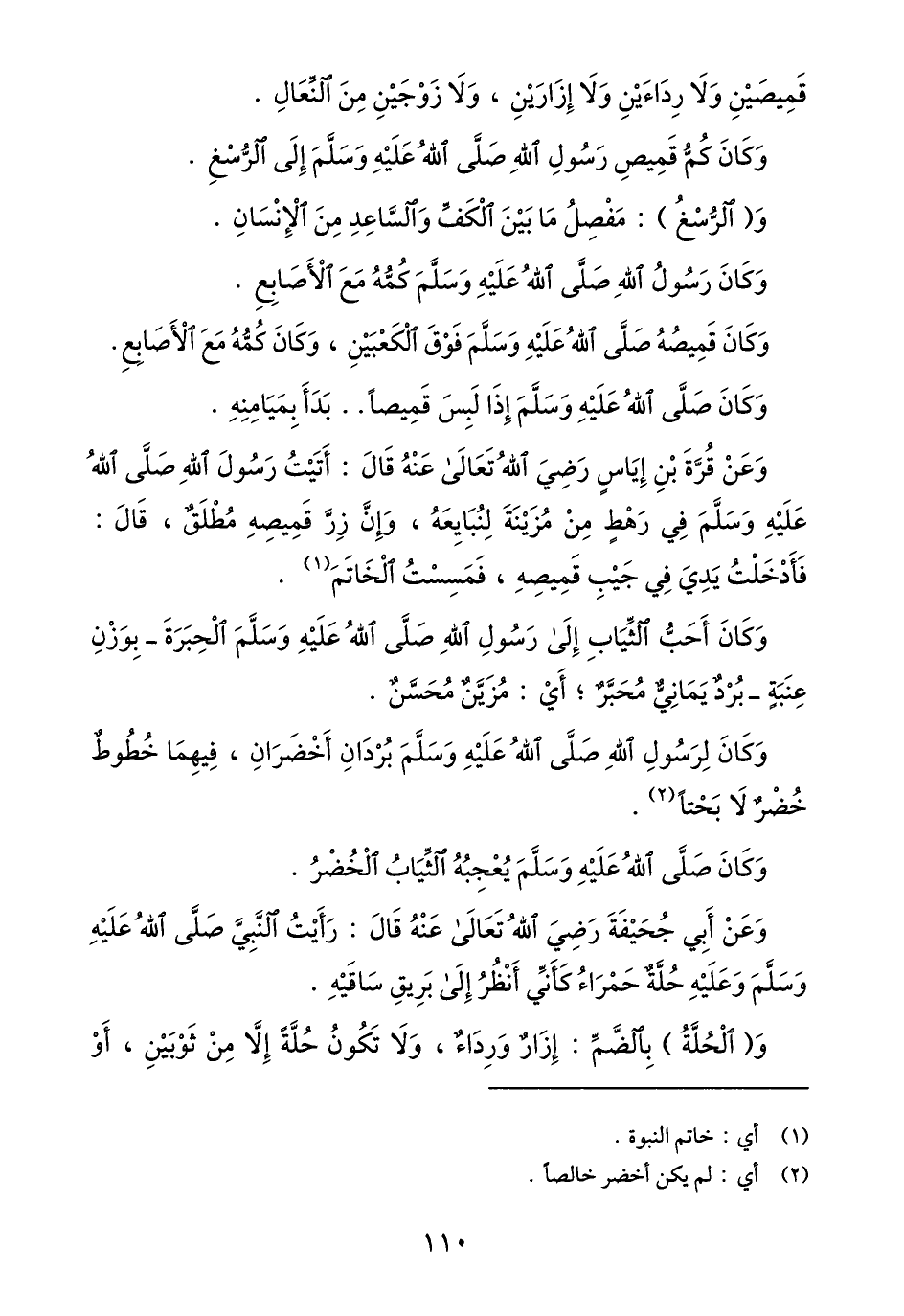 وكان قميصه صلّى الله عليه وسلّم فوق الكعبين، وكان كمّه مع الأصابع.