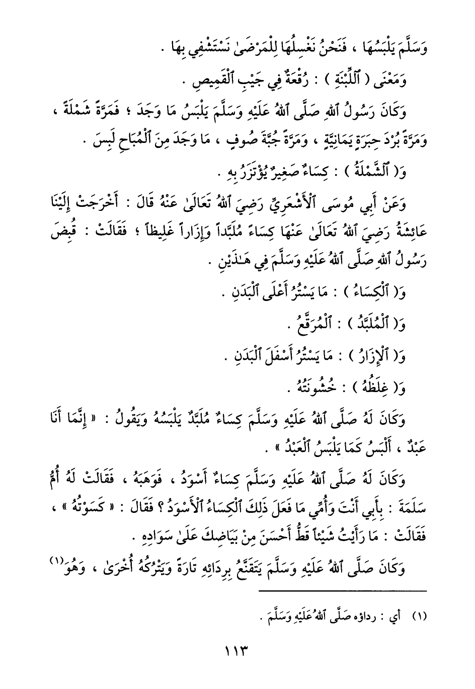 وكان رسول الله صلّى الله عليه وسلّم يلبس ما وجد؛ فمرّة شملة، ومرّة برد حبرة يمانيّة، ومرّة جبّة صوف، ما وجد من المباح لبس.