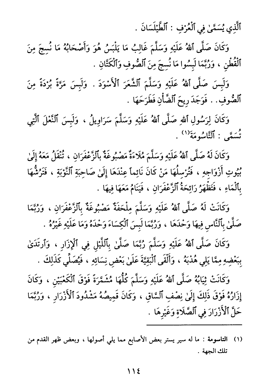 وكانت له صلّى الله عليه وسلّم ملحفة مصبوغة بالزّعفران، وربّما صلّى بالنّاس فيها واحدها، وربّما لبس الكساء واحده وما عليه غيره.
