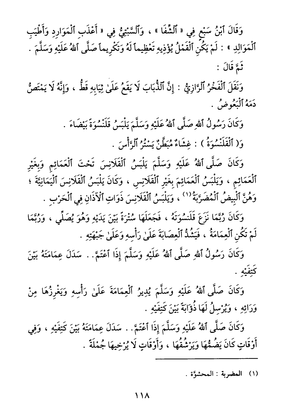 وكان صلّى الله عليه وسلّم إذا اعتمّ.. سدل عمامته بين كتفيه، وفي أوقات كان يضمّها ويرشقها، وأوقات لا يرخيها جملة.