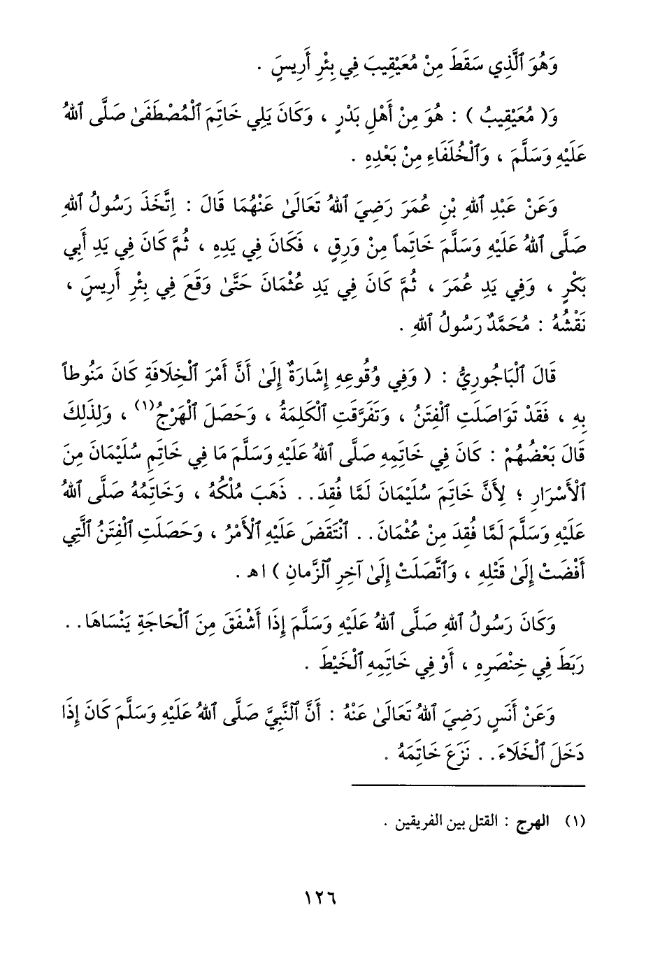 قال الباجوريّ: (وفي وقوعه إشارة إلى أنّ أمر الخلافة كان منوطا به، فقد تواصلت الفتن، وتفرّقت الكلمة، وحصل الهرج «1» ، ولذلك قال بعضهم: كان في خاتمه صلّى الله عليه وسلّم ما في خاتم سليمان من الأسرار؛ لأنّ خاتم سليمان لمّا فقد.. ذهب ملكه، وخاتمه صلّى الله عليه وسلّم لمّا فقد من عثمان.. انتقض عليه الأمر، وحصلت الفتن الّتي أفضت إلى قتله، واتّصلت إلى اخر الزّمان) اهـ.