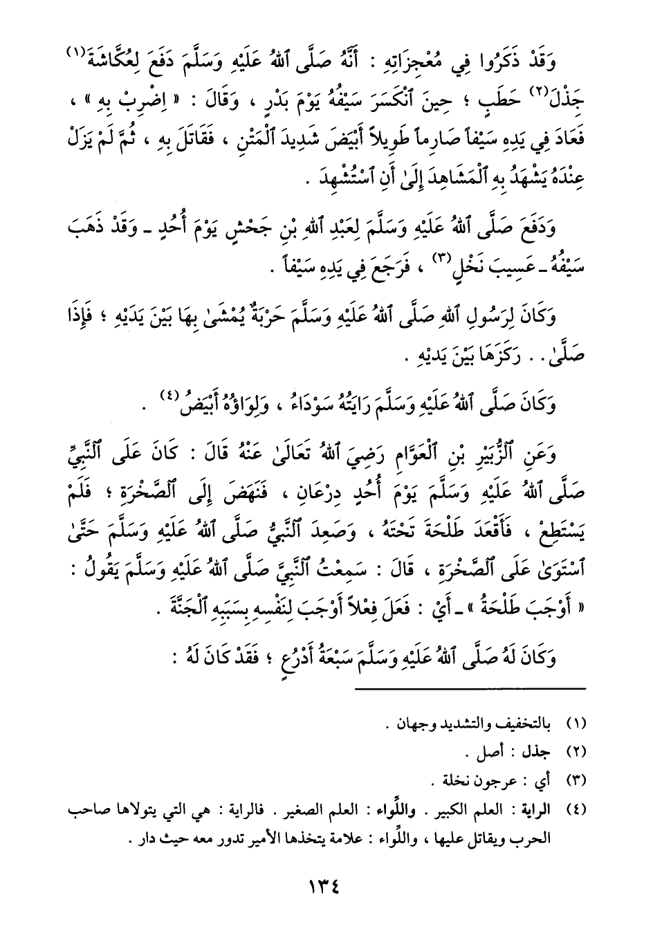 وقد ذكروا في معجزاته: أنّه صلّى الله عليه وسلّم دفع لعكّاشة «1» جذل «2» حطب؛ حين انكسر سيفه يوم بدر، وقال: «اضرب به» ، فعاد في يده سيفا صارما طويلا أبيض شديد المتن، فقاتل به، ثمّ لم يزل عنده يشهد به المشاهد إلى أن استشهد.