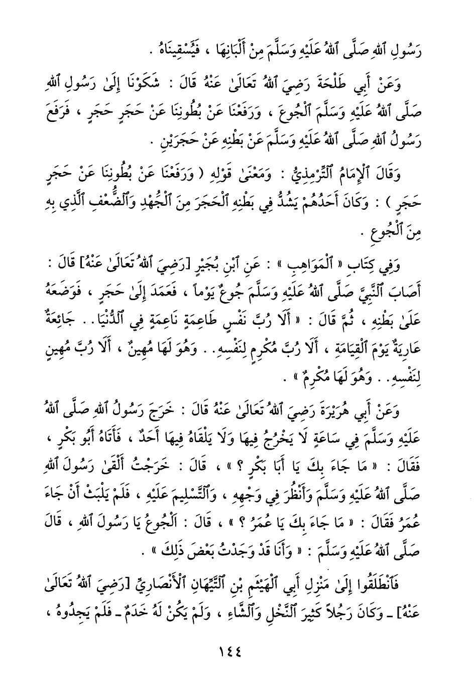 وعن أبي طلحة رضي الله تعالى عنه قال: شكونا إلى رسول الله صلّى الله عليه وسلّم الجوع، ورفعنا عن بطوننا عن حجر حجر، فرفع رسول الله صلّى الله عليه وسلّم عن بطنه عن حجرين.