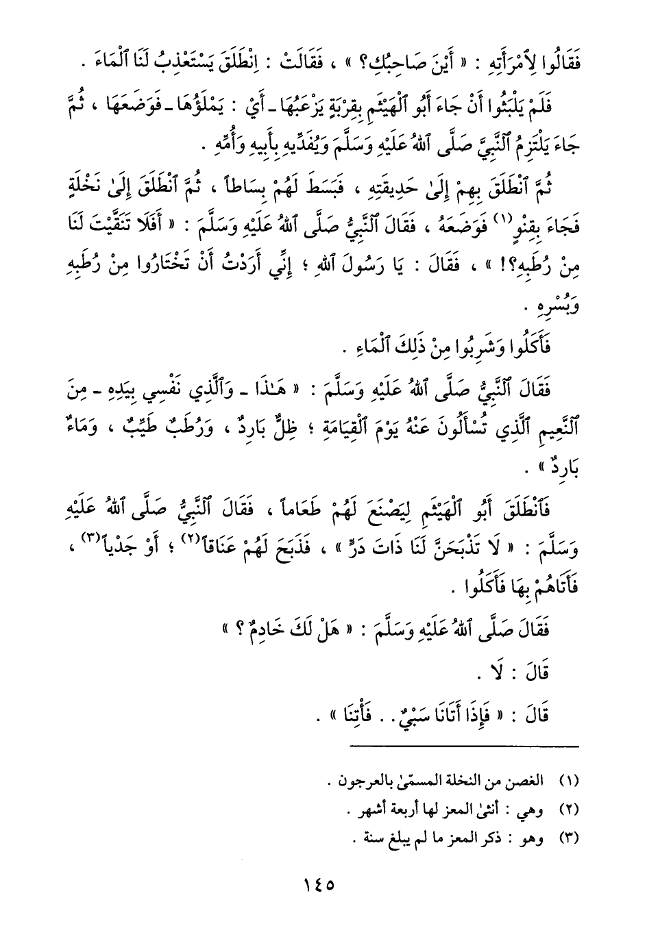فانطلق أبو الهيثم ليصنع لهم طعاما، فقال النّبيّ صلّى الله عليه وسلّم: «لا تذبحنّ لنا ذات درّ» ، فذبح لهم عناقا «2» ؛ أو جديا «3» ، فأتاهم بها فأكلوا.