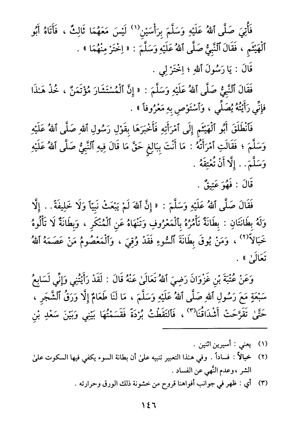 فأتي صلّى الله عليه وسلّم برأسين «1» ليس معهما ثالث، فأتاه أبو الهيثم، فقال النّبيّ صلّى الله عليه وسلّم: «اختر منهما» .
